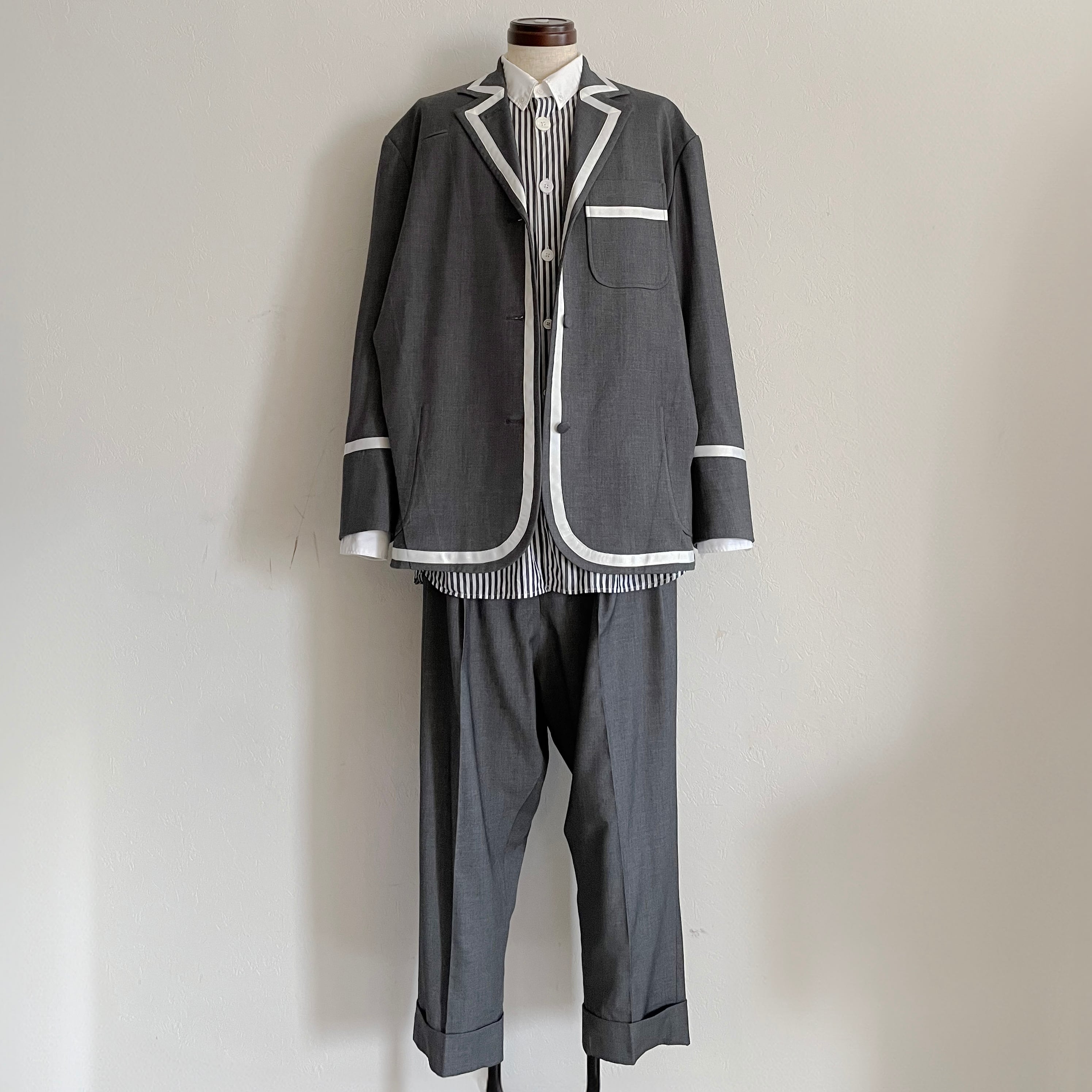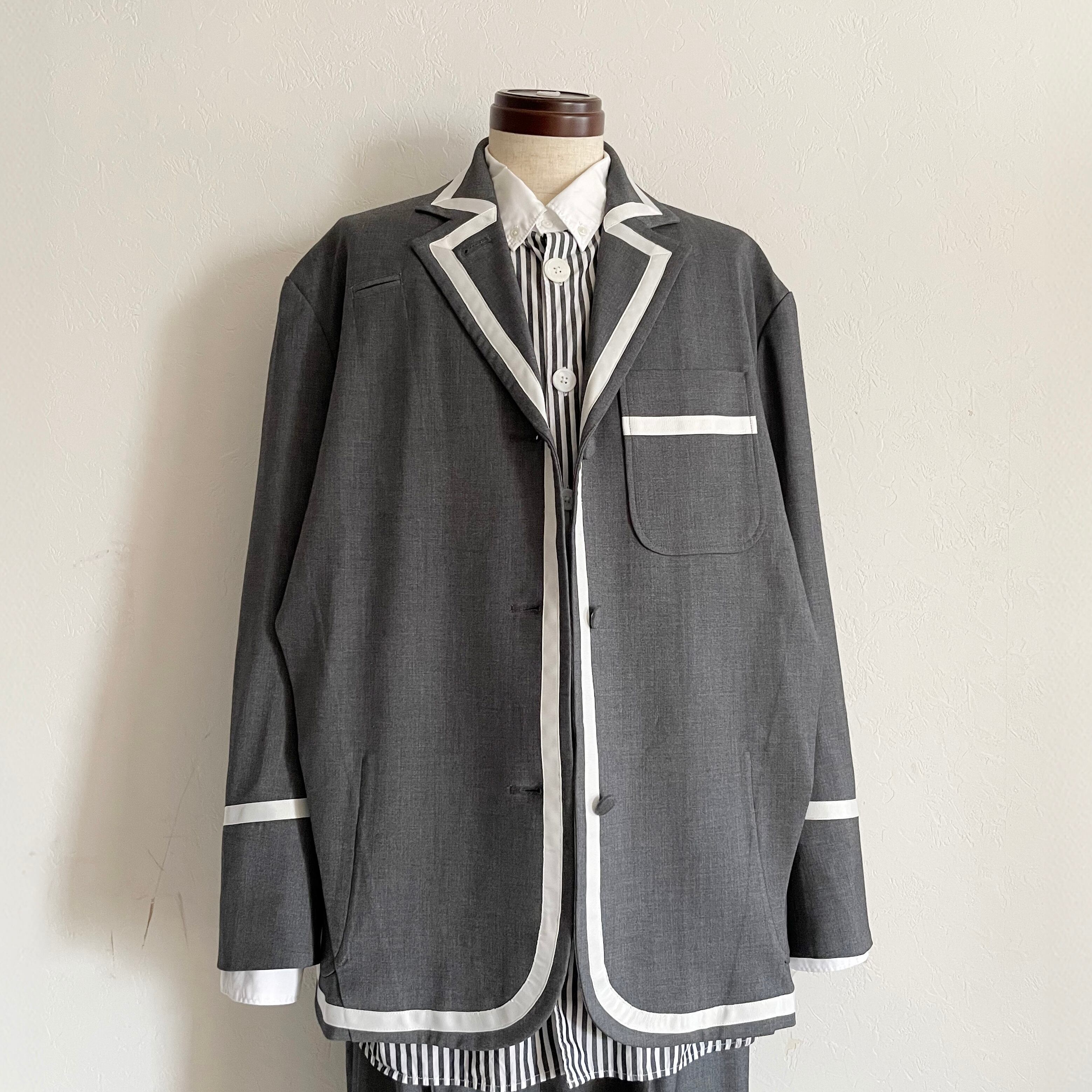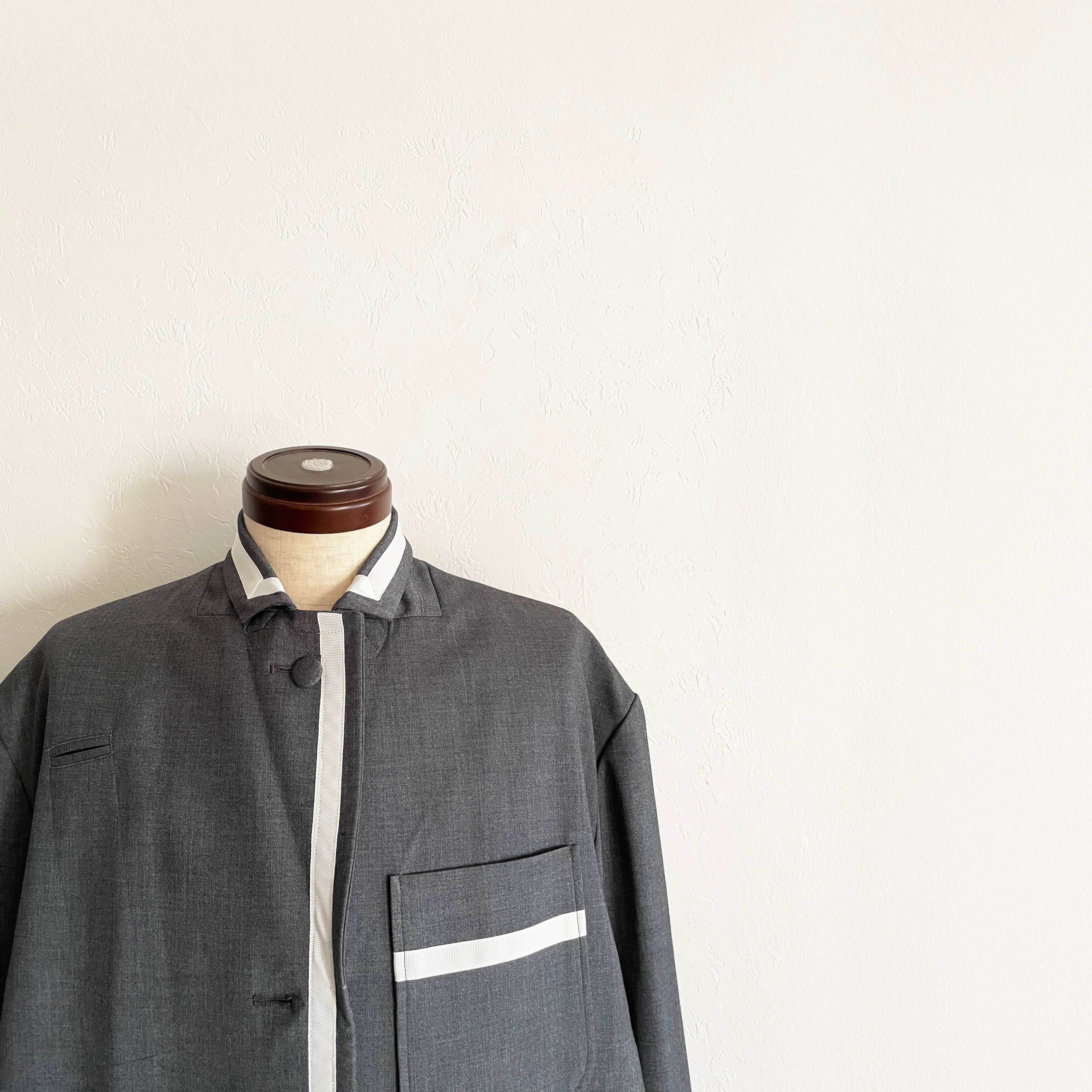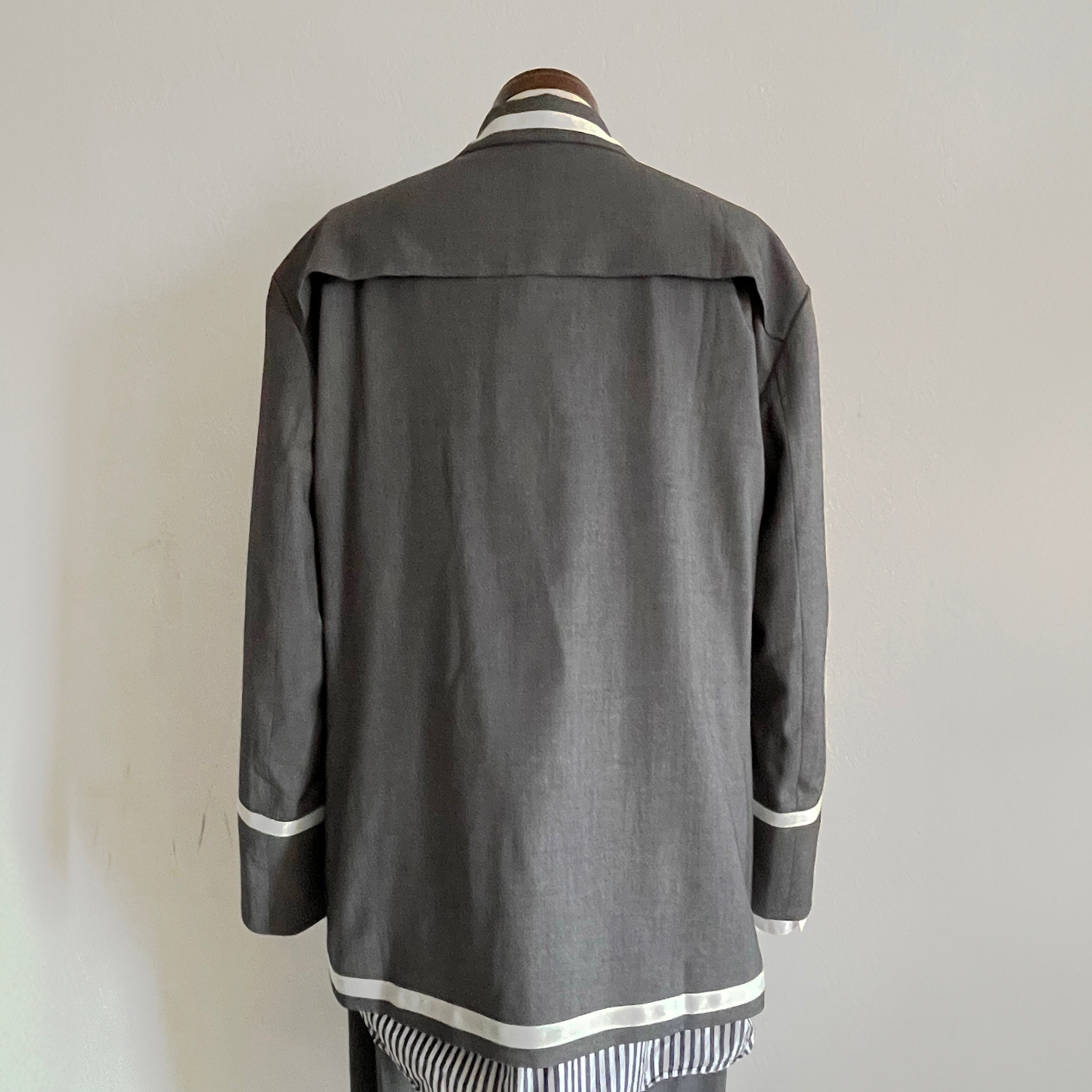 一見すると、これは単にグレイのウールギャバジンのセットアップに白いパイピングを施しただけのように見えるかもしれません。しかし、よく見ると、このジャケットは既存の服作りの概念から意図的に逸脱しています。