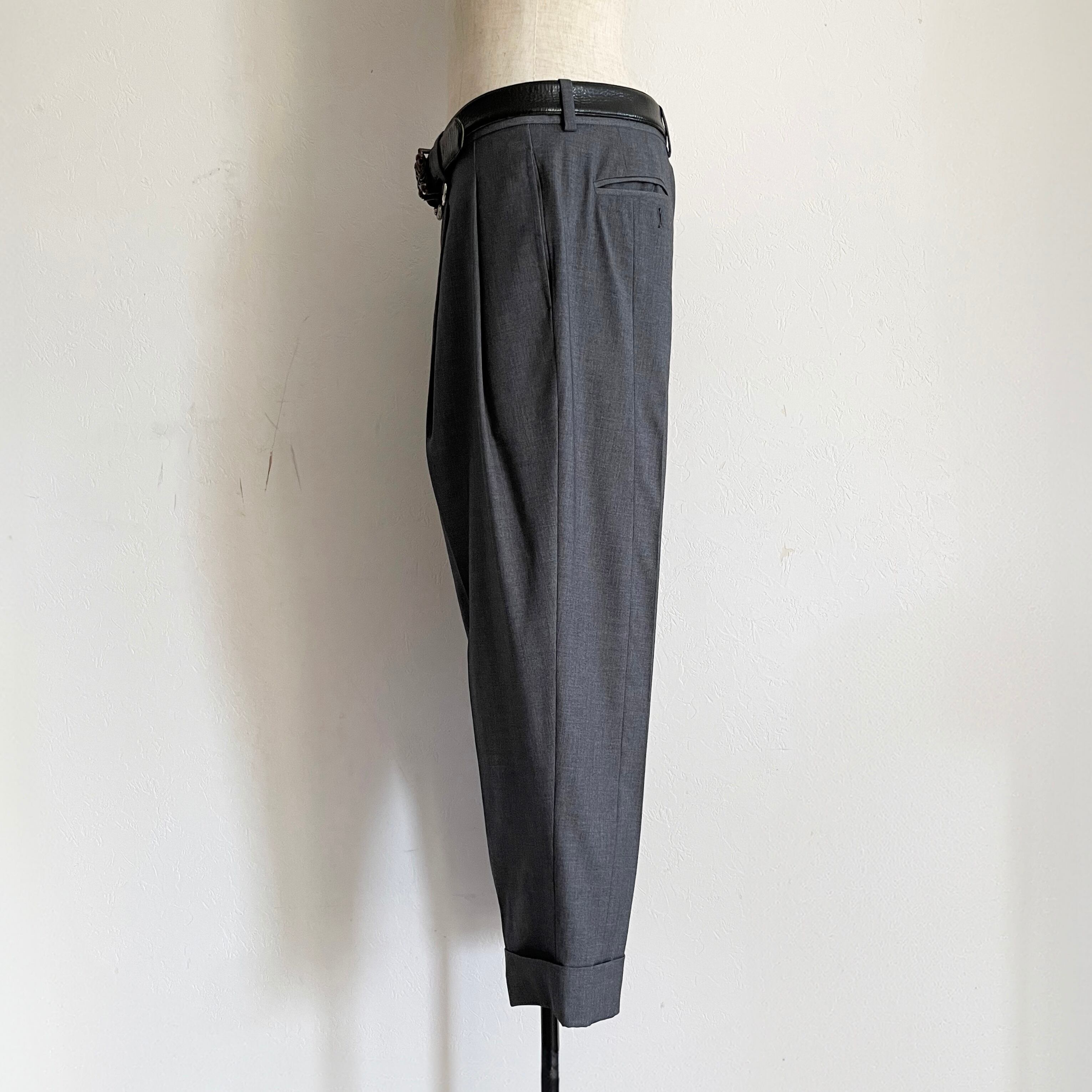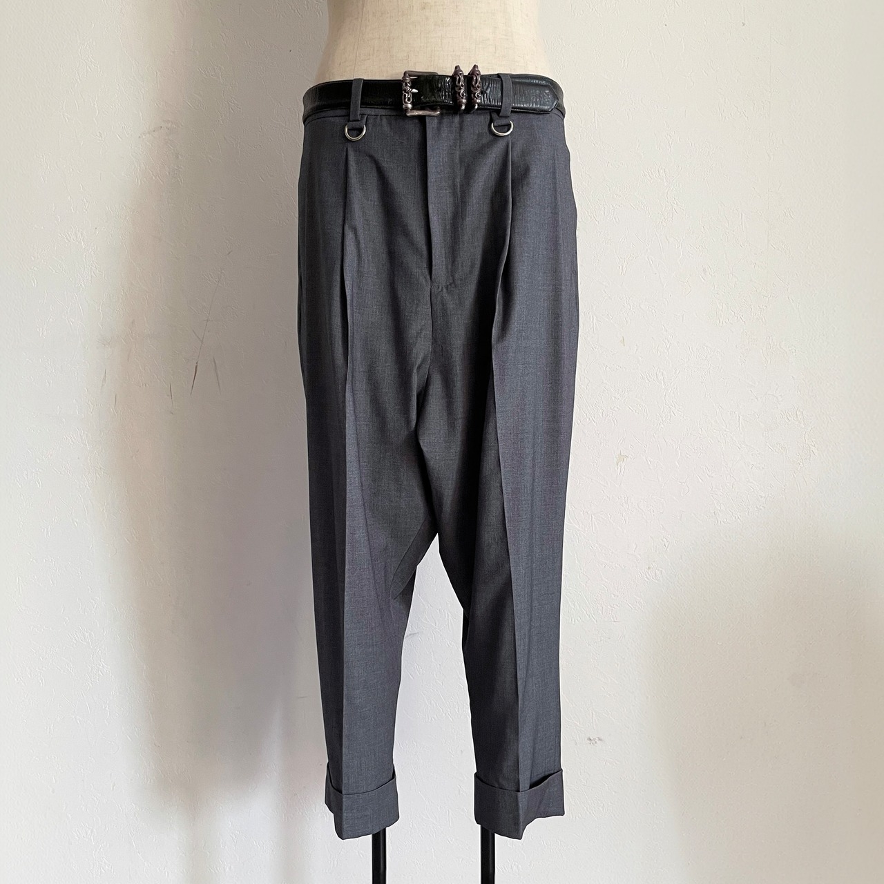 パンツはパンクカルチャーの象徴的存在であるボンテージパンツのバックジップデザインを後身頃に落とし込み、現代的に昇華させています。股上は敢えて深く設計され、2タックによってワタリに豊かな余裕を持たせながらも、裾に向かって細くなるシルエット。そして6cmという大胆なダブル幅を採用することで、独特なキャロットパンツ的なシルエットを実現しています。反骨の精神を、洗練された現代的解釈で表現しているのです。