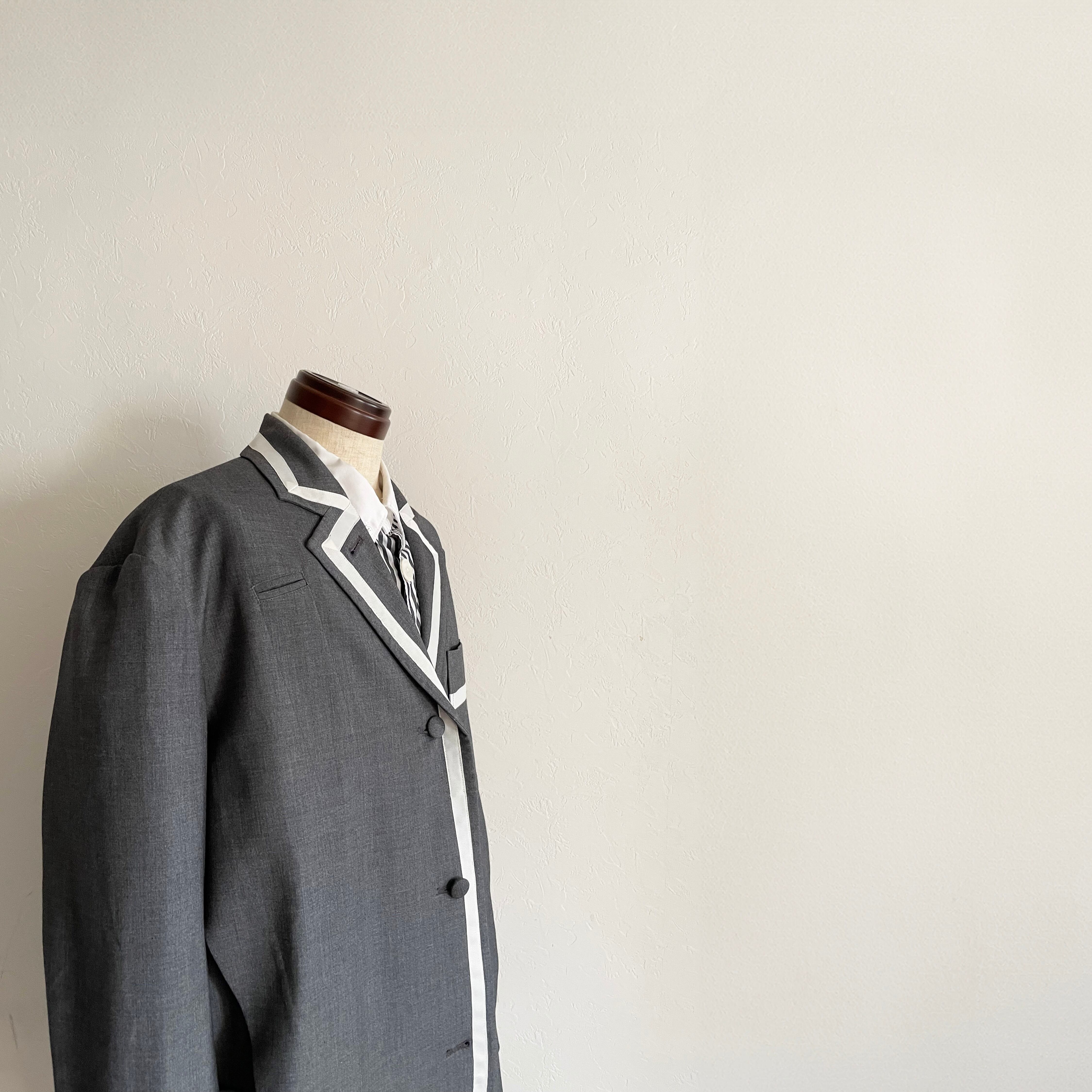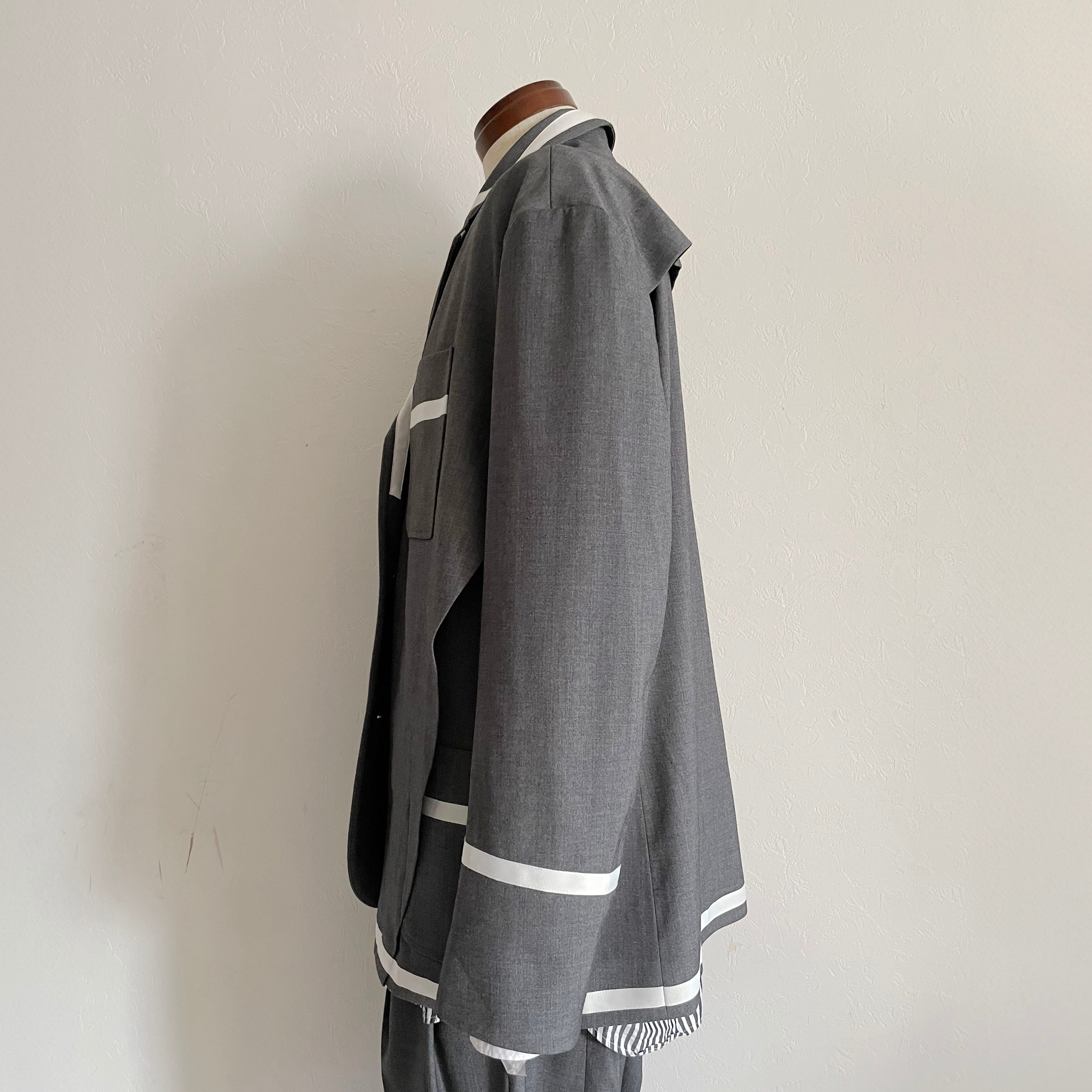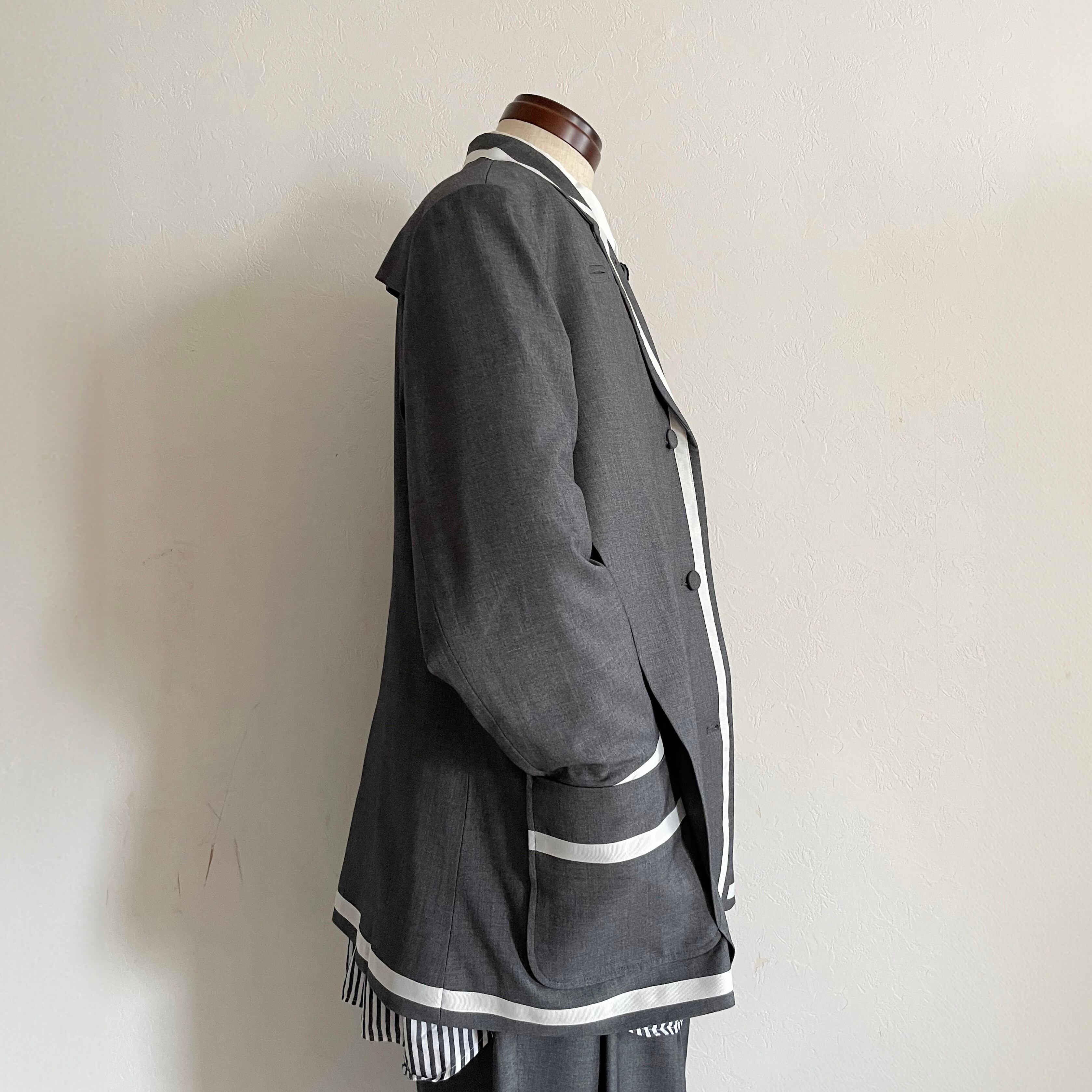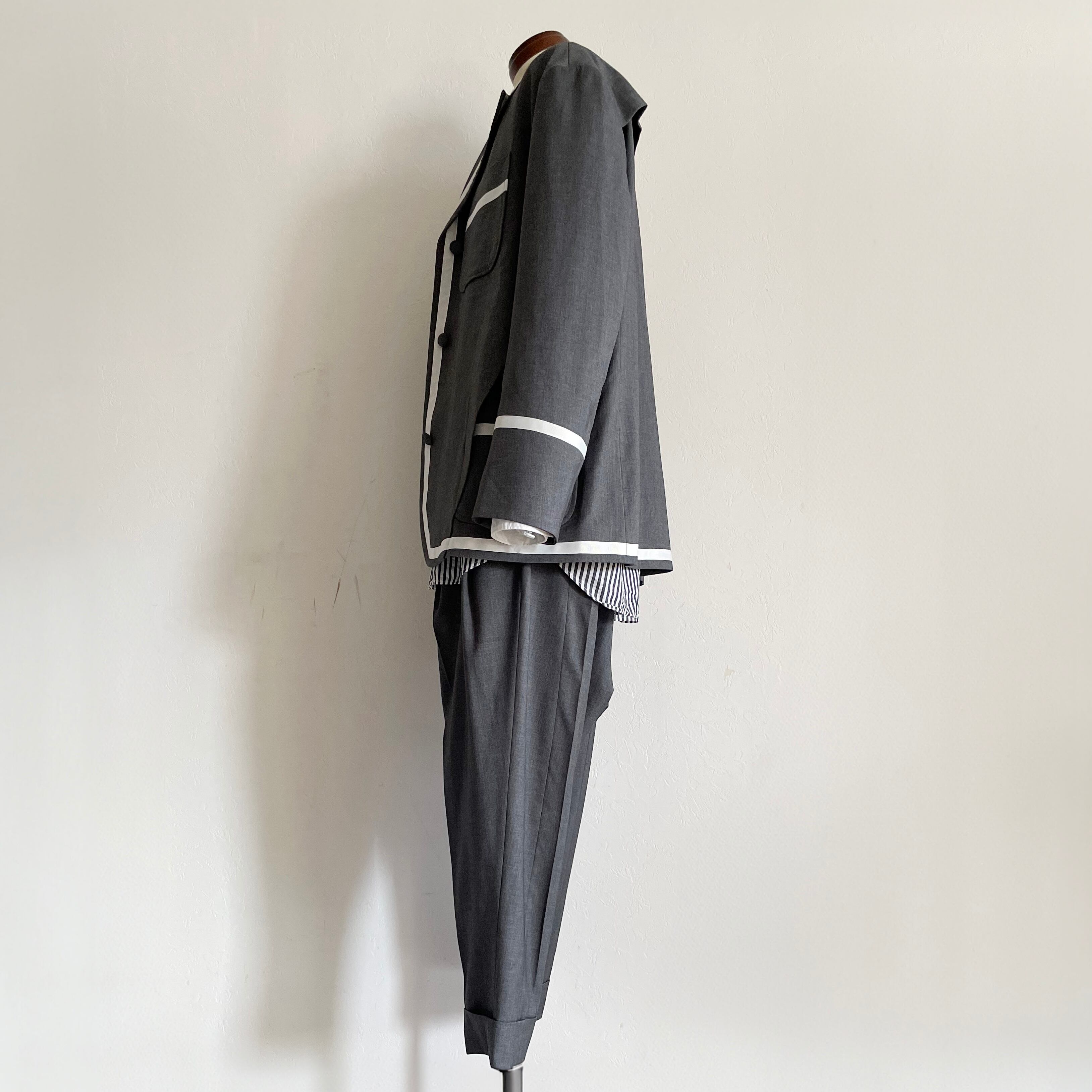 一見すると、これは単にグレイのウールギャバジンのセットアップに白いパイピングを施しただけのように見えるかもしれません。しかし、よく見ると、このジャケットは既存の服作りの概念から意図的に逸脱しています。