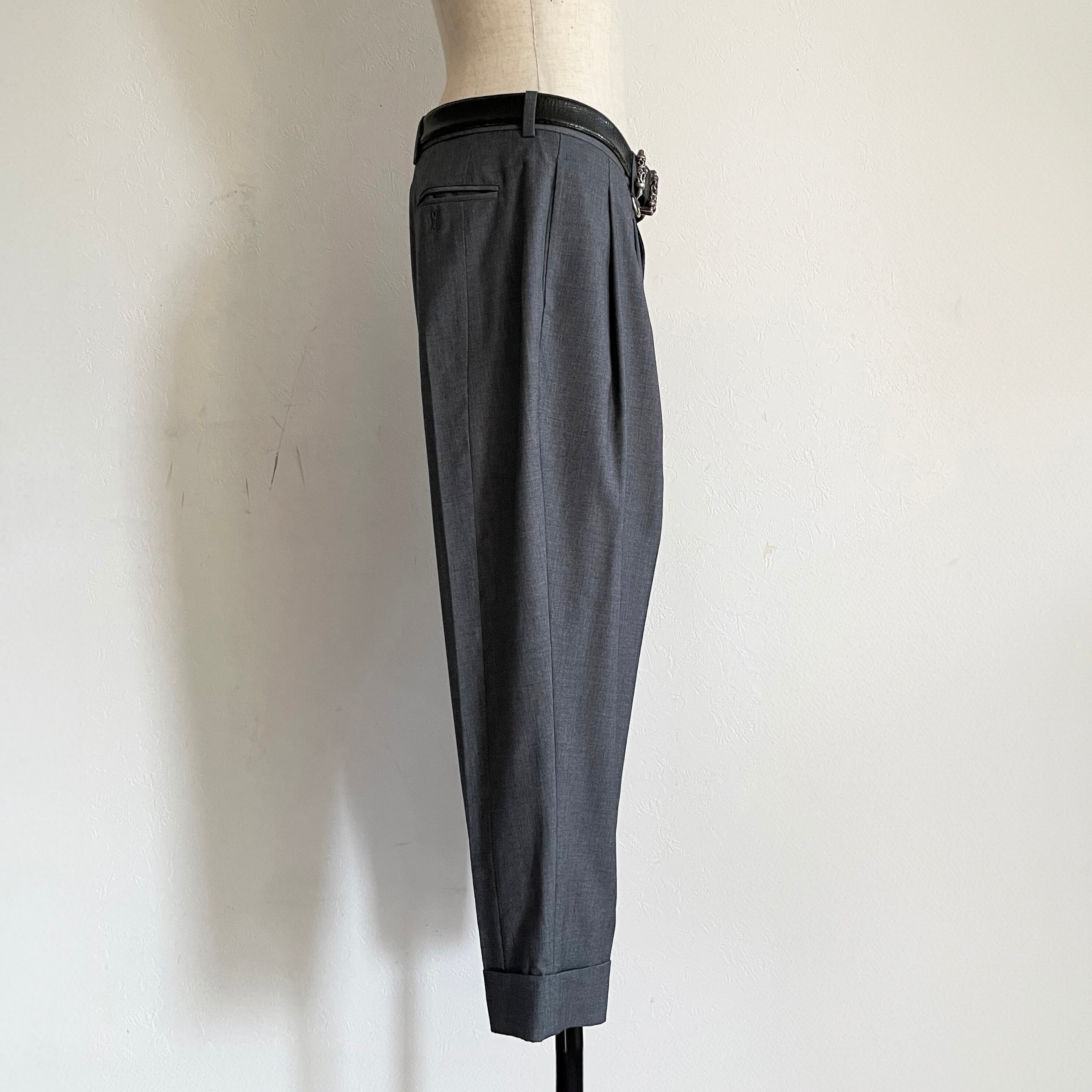 パンツはパンクカルチャーの象徴的存在であるボンテージパンツのバックジップデザインを後身頃に落とし込み、現代的に昇華させています。股上は敢えて深く設計され、2タックによってワタリに豊かな余裕を持たせながらも、裾に向かって細くなるシルエット。そして6cmという大胆なダブル幅を採用することで、独特なキャロットパンツ的なシルエットを実現しています。反骨の精神を、洗練された現代的解釈で表現しているのです。