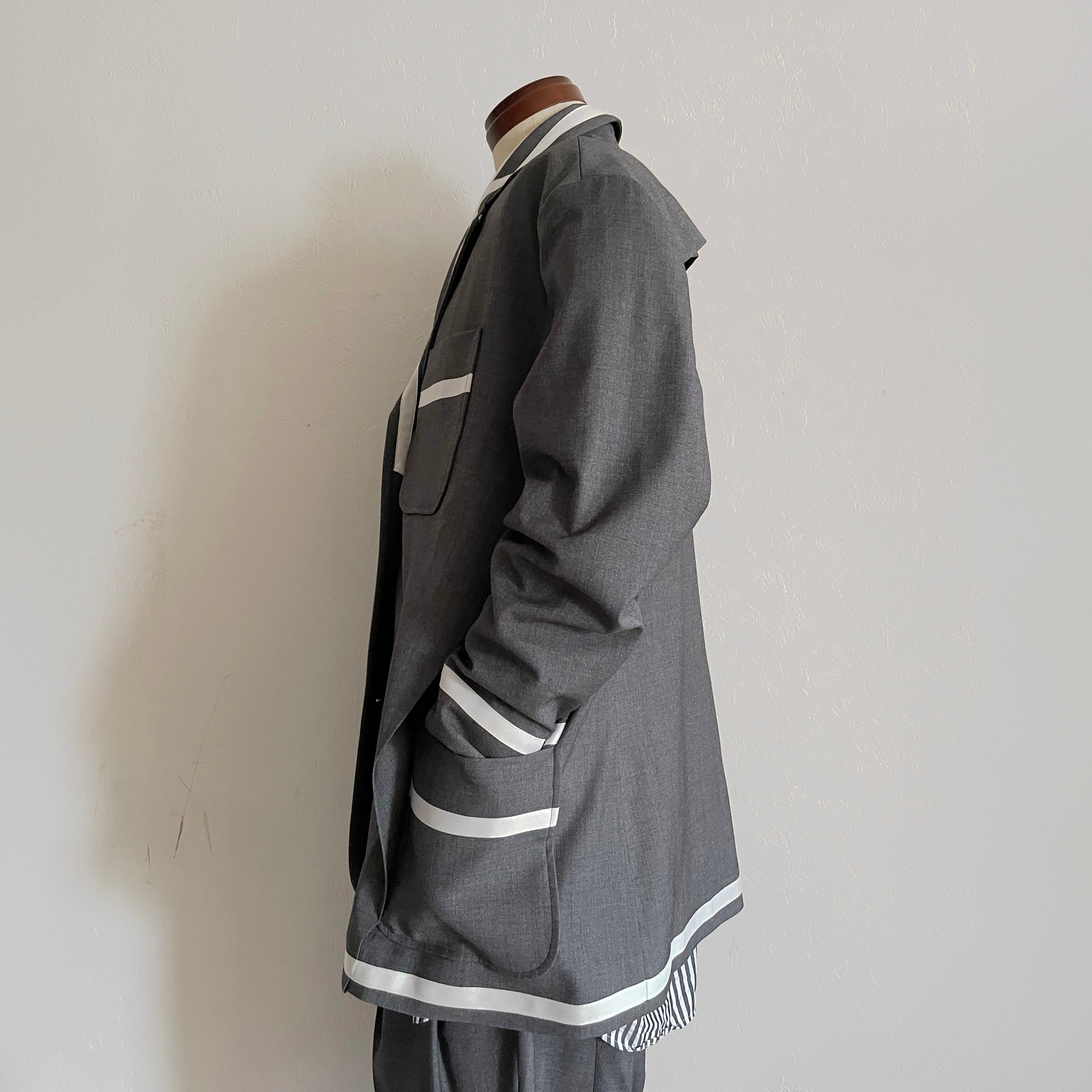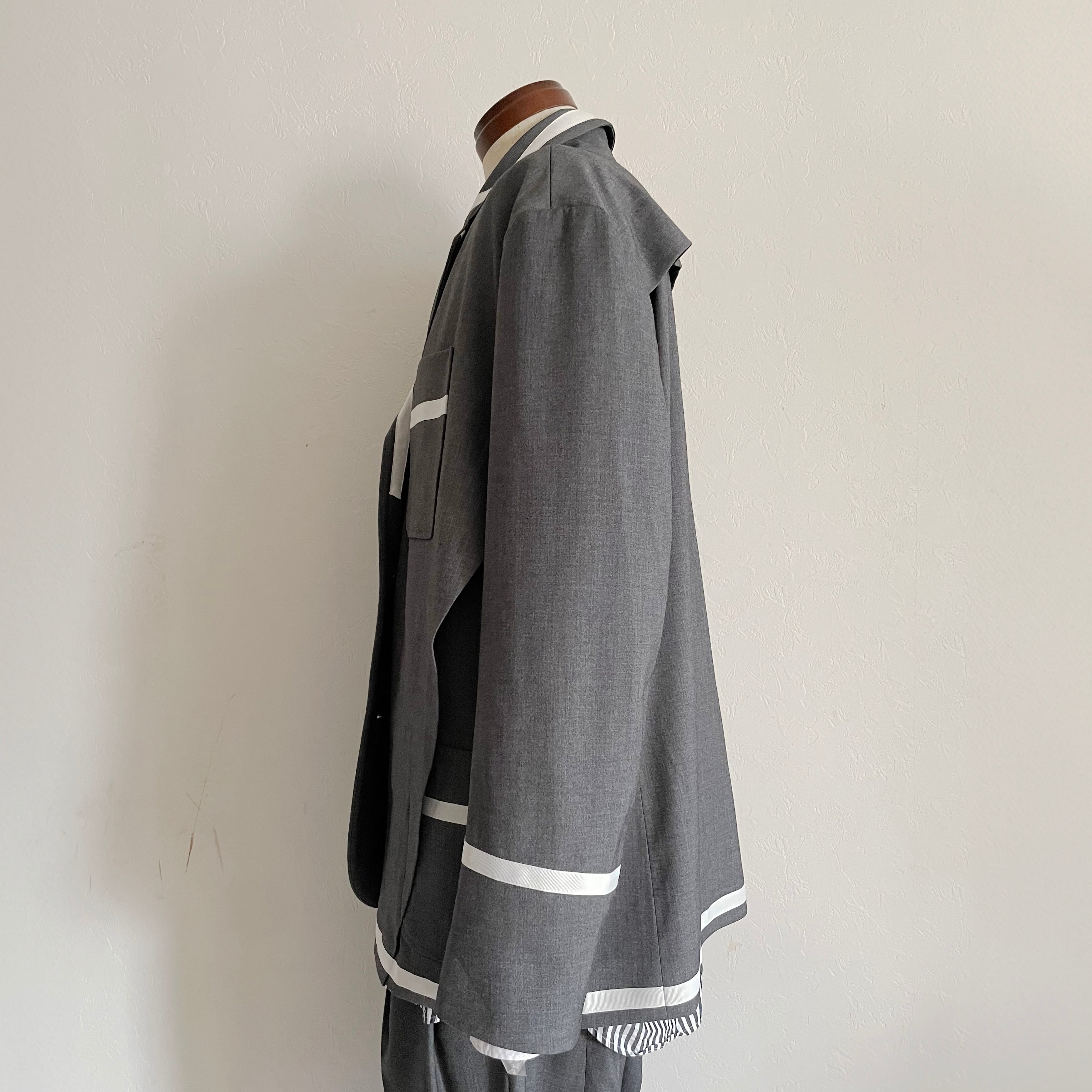 一見すると、これは単にグレイのウールギャバジンのジャケットに白いパイピングを施しただけのように見えるかもしれません。しかし、よく見ると、このジャケットは既存の服作りの概念から意図的に逸脱しています。