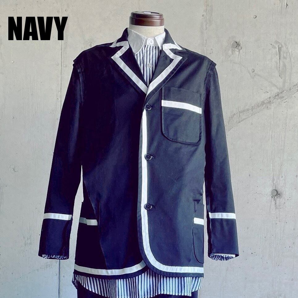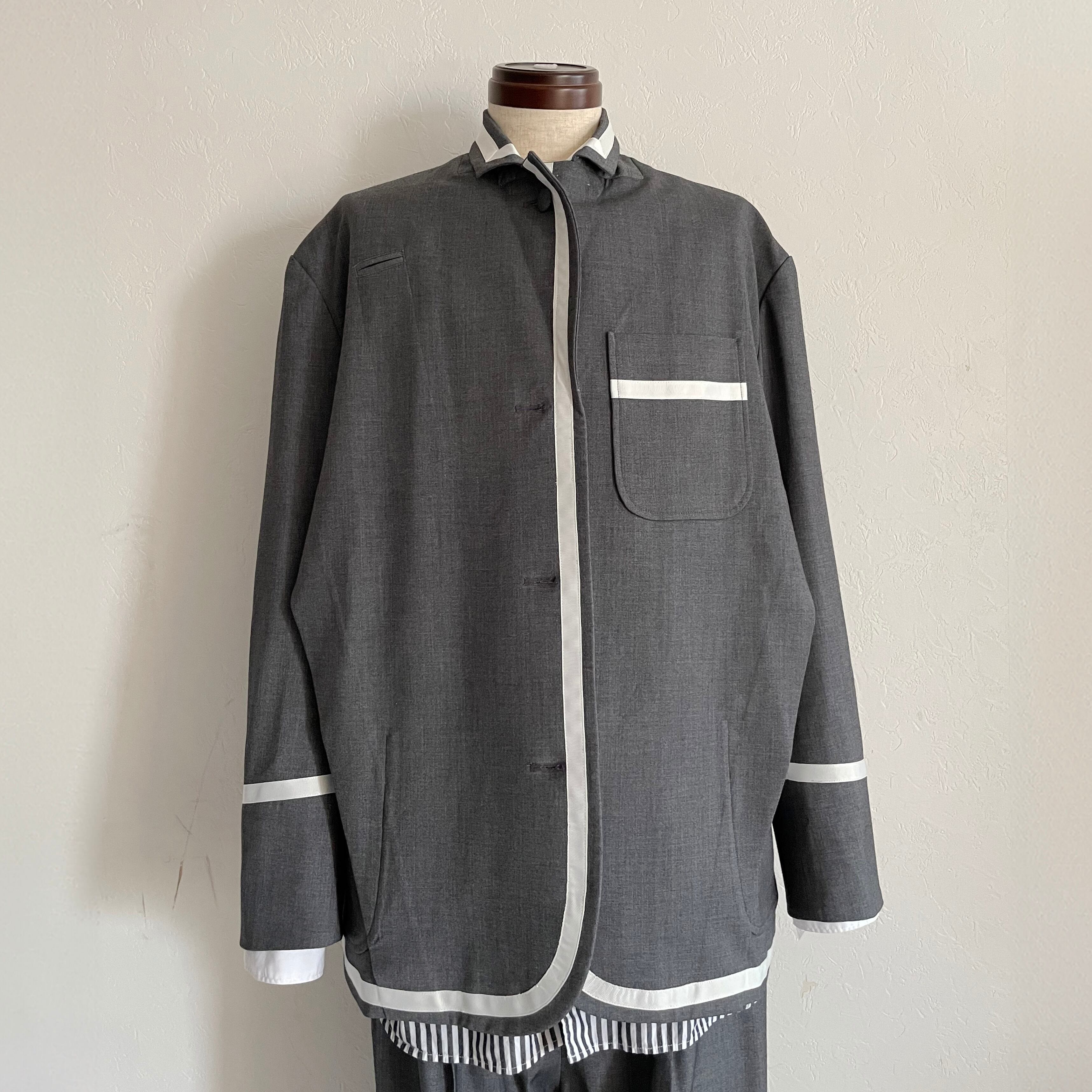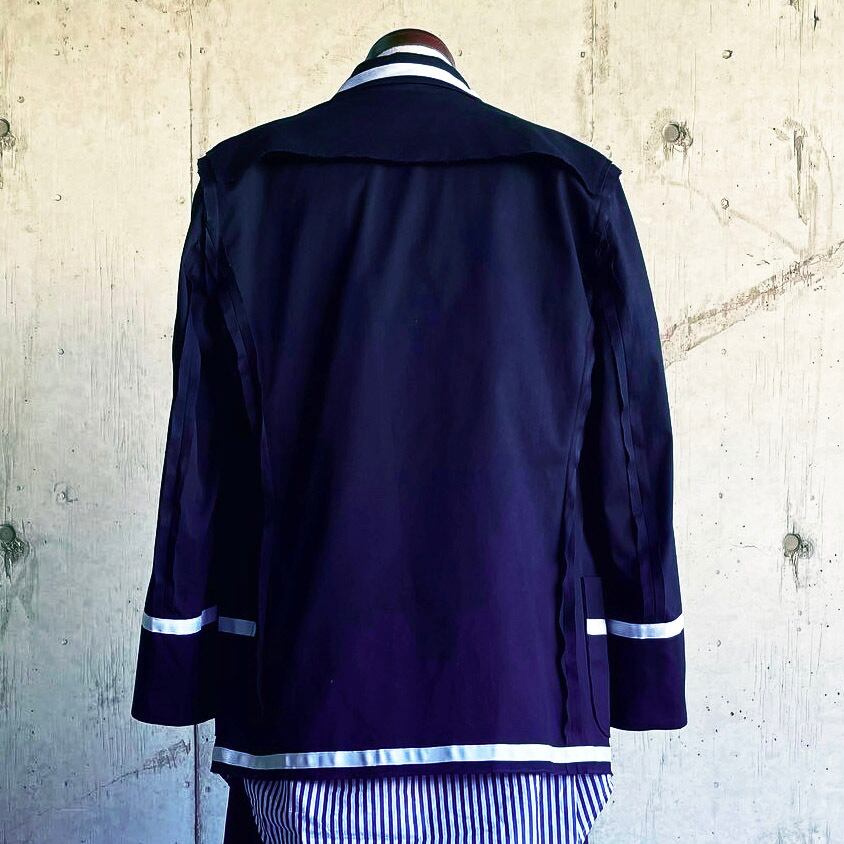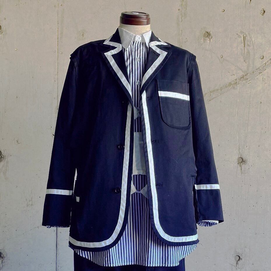 このジャケットの革新性は、通常は隠される「裏側」のデザインを敢えて表に出した構造にあります。裏返しにした時の縫製や構造美を前面に押し出すことで、服作りの常識に挑戦しています。白いパイピングは、この「反転」の境界線を象徴的に示し、服の概念そのものを問い直す試みなのです。
