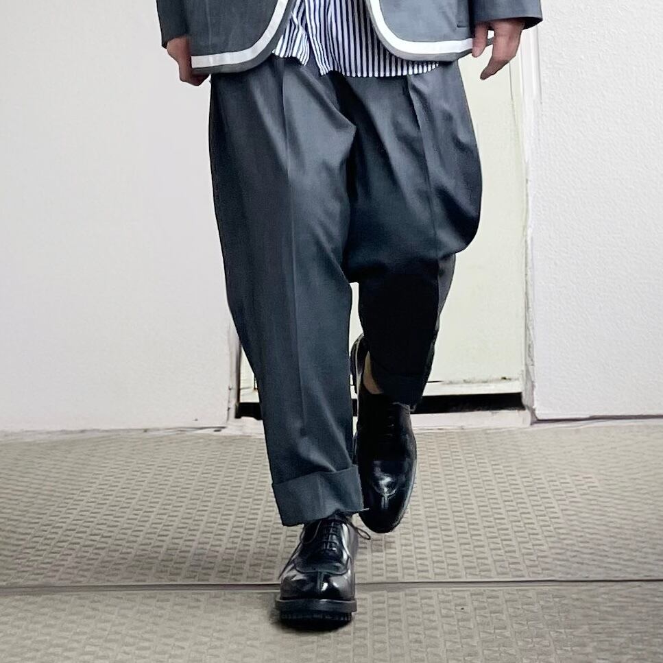 パンツはパンクカルチャーの象徴的存在であるボンテージパンツのバックジップデザインを後身頃に落とし込み、現代的に昇華させています。股上は敢えて深く設計され、2タックによってワタリに豊かな余裕を持たせながらも、裾に向かって細くなるシルエット。そして6cmという大胆なダブル幅を採用することで、独特なキャロットパンツ的なシルエットを実現しています。反骨の精神を、洗練された現代的解釈で表現しているのです。