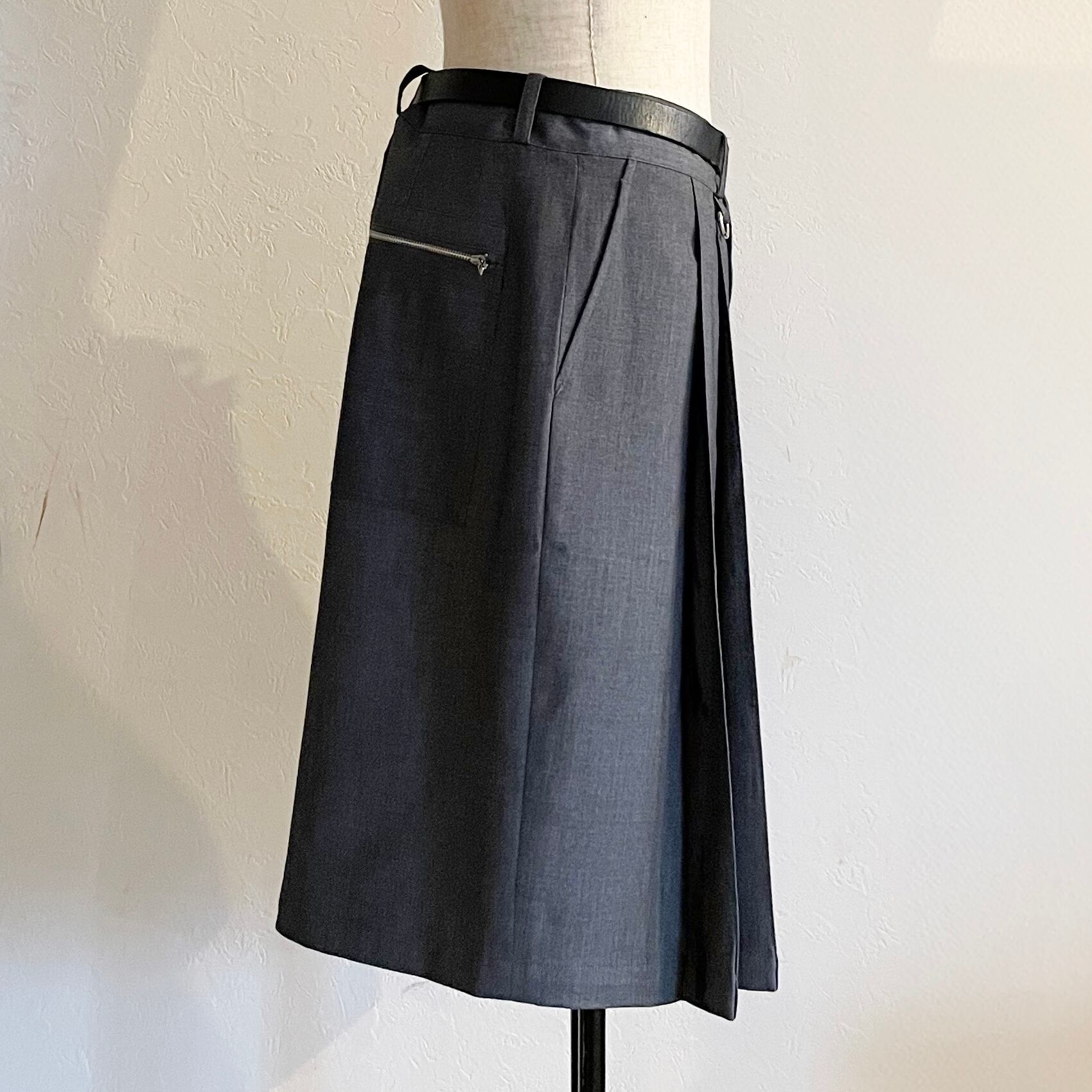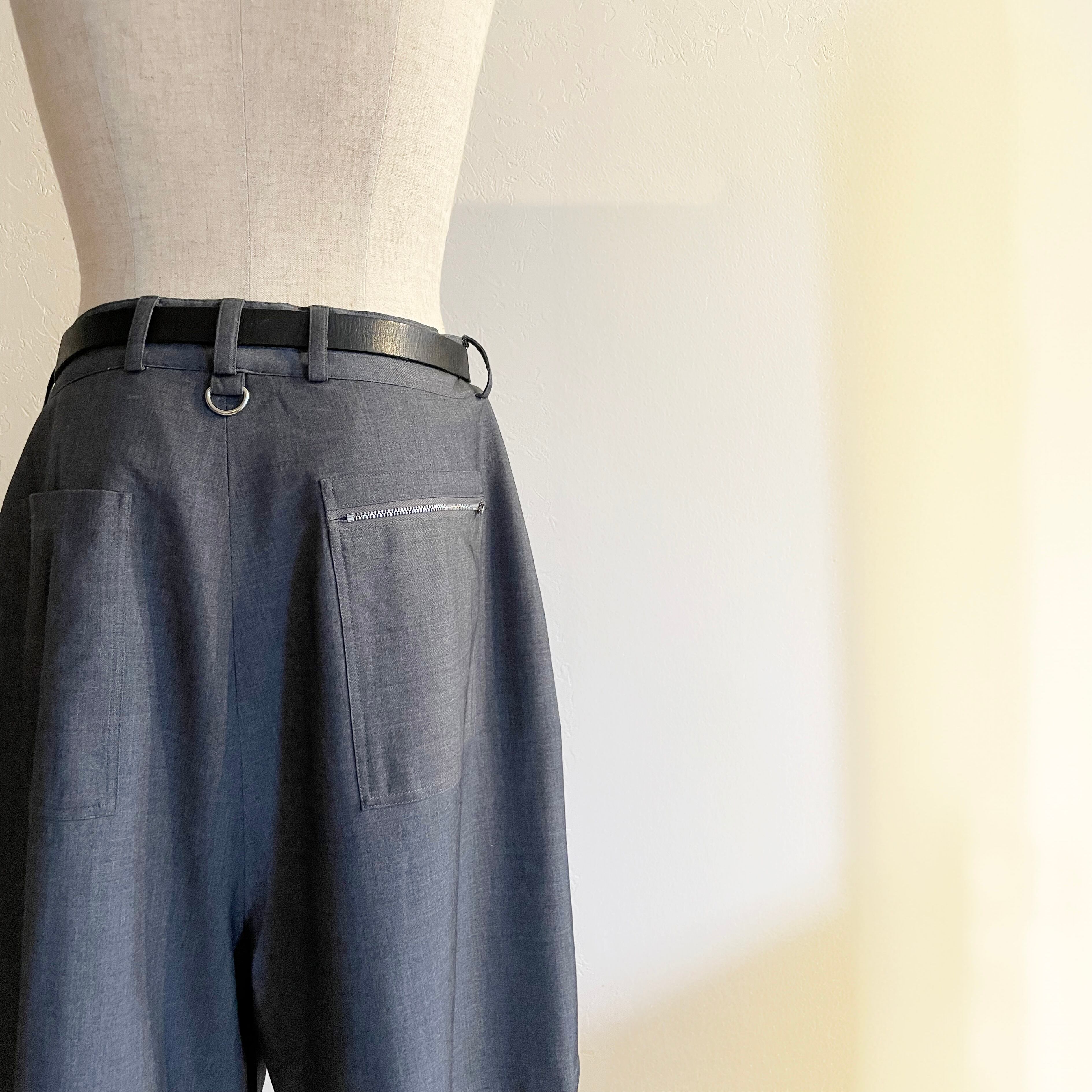 ・ボリューム感を出し、ウエストに60mm幅のタックを2本設ける事で綺麗な広がりとドレープ感があり、また膝下ぐらいまでの着丈でワイドなシルエットで尚且つサイズ感は大きめです。
