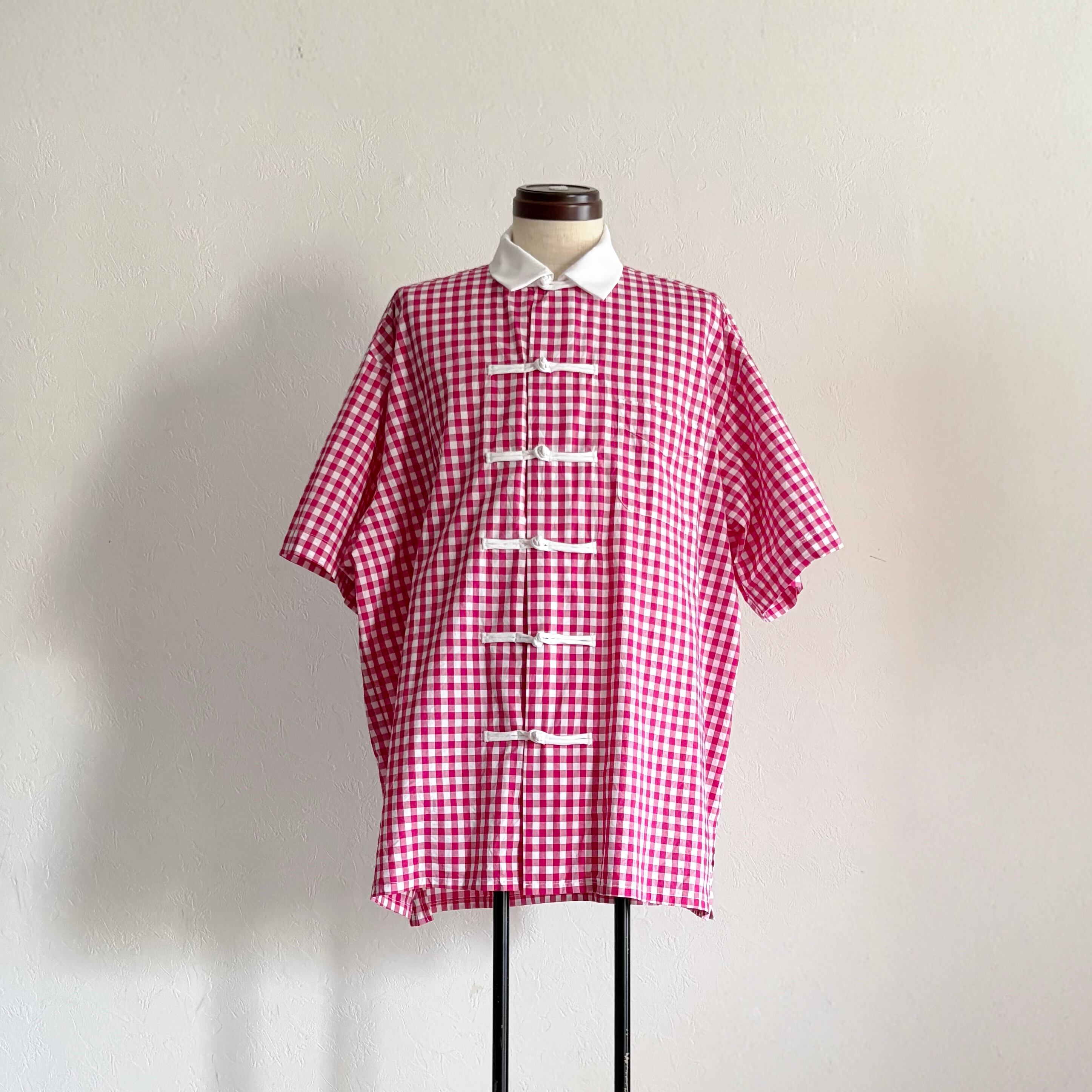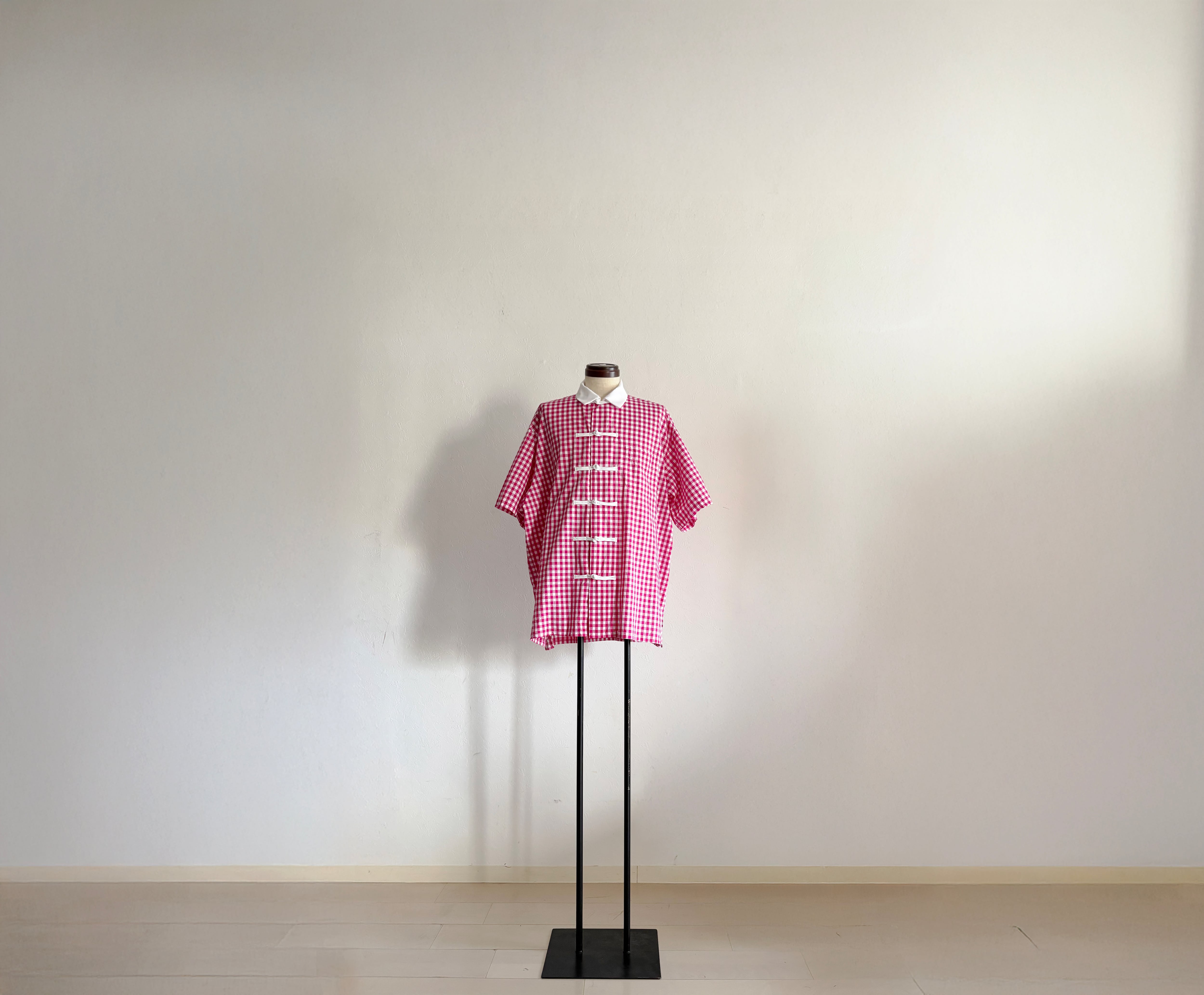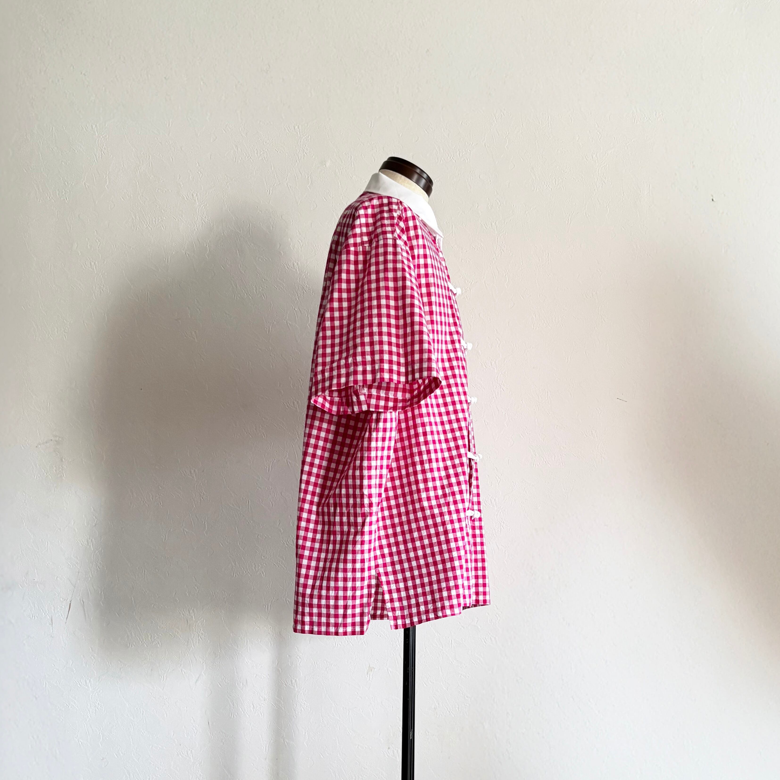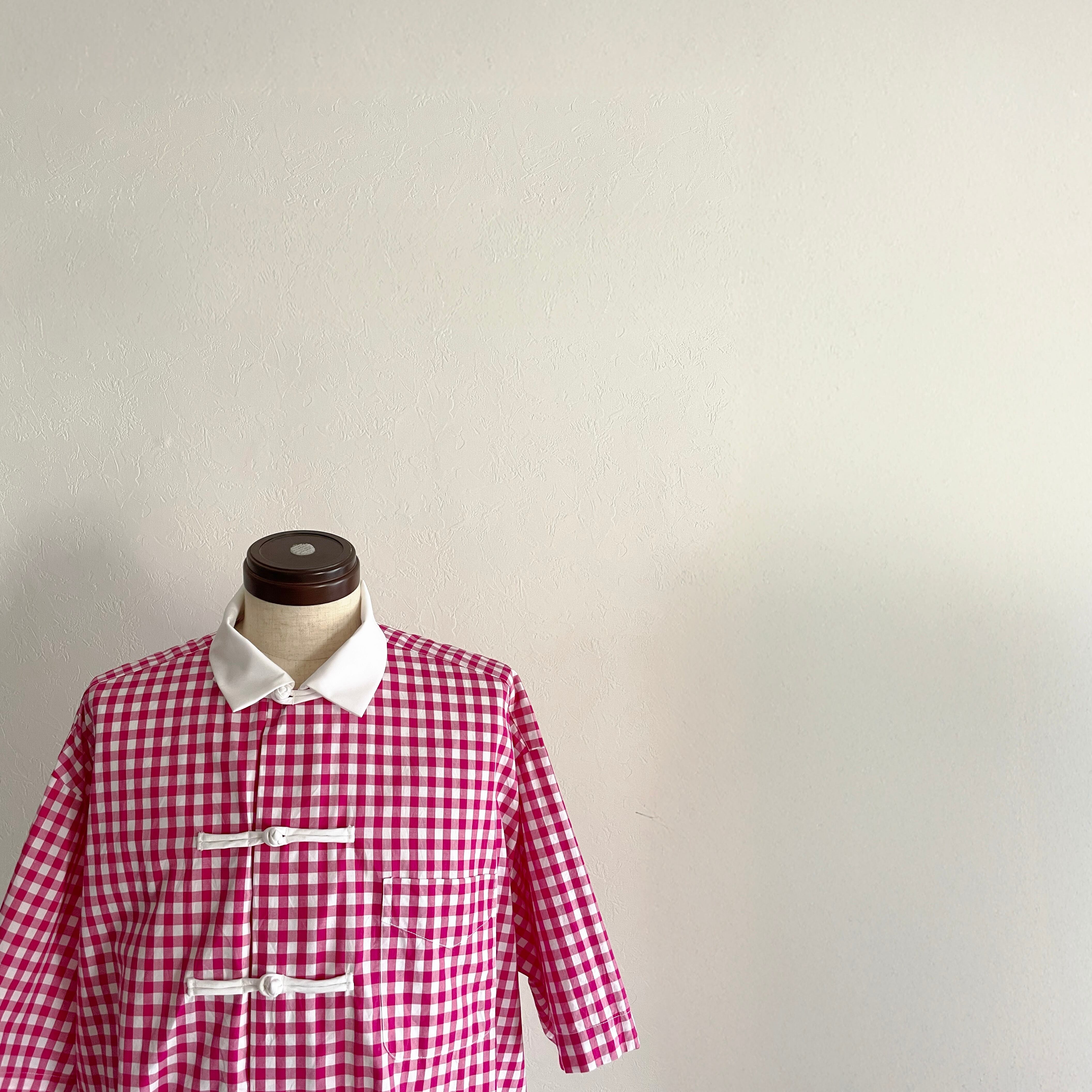 ピンクのギンガムチェックに、白いチャイナボタンを5つ。