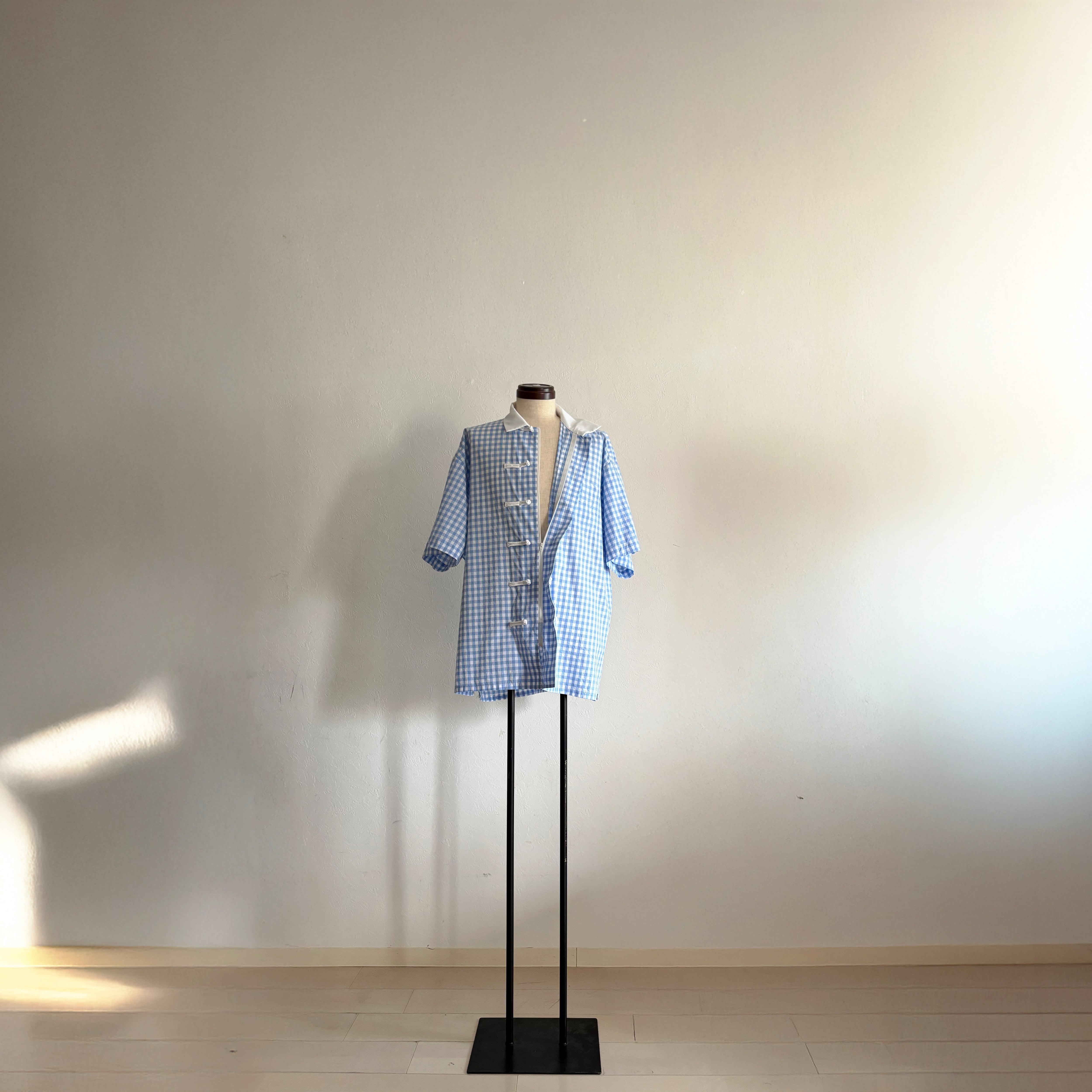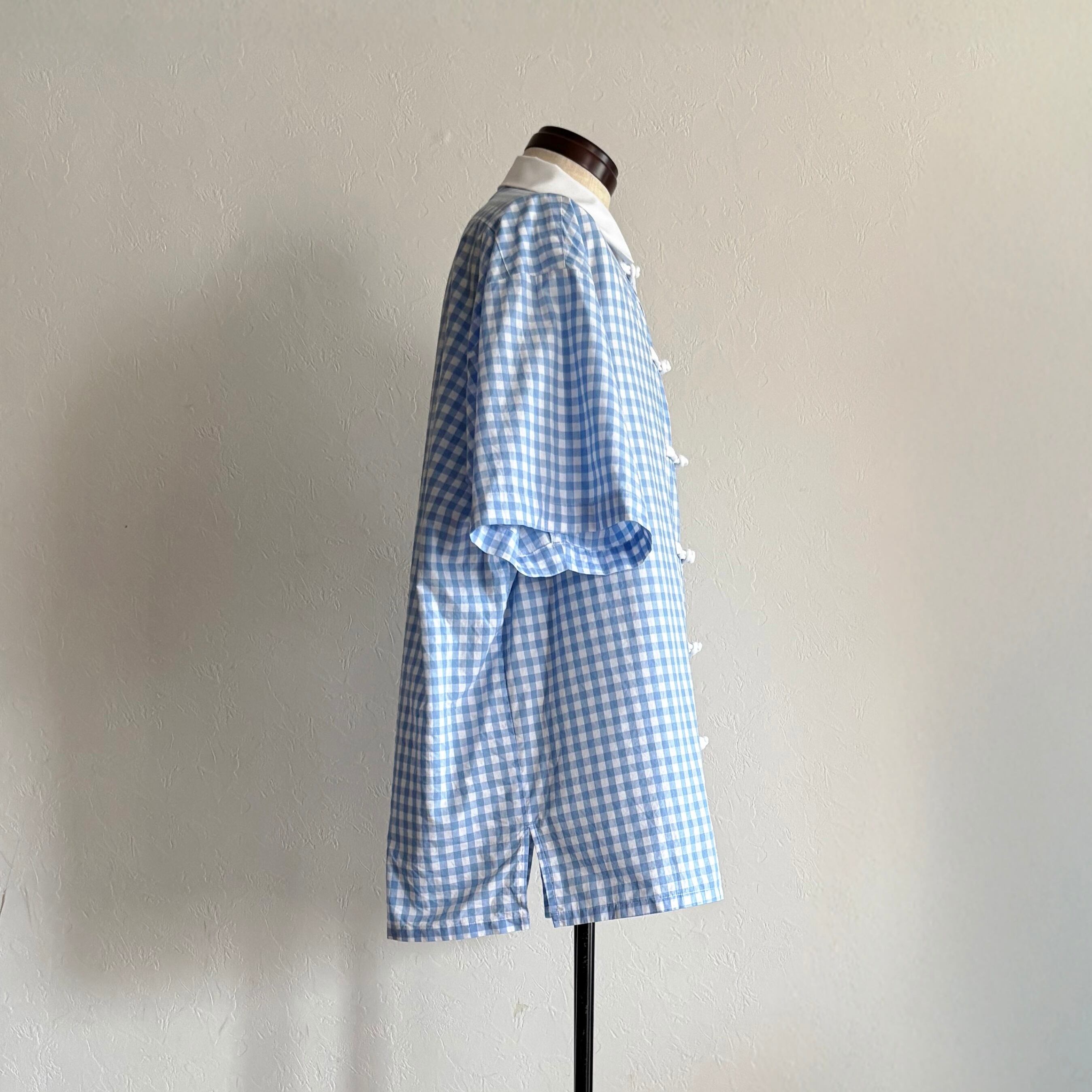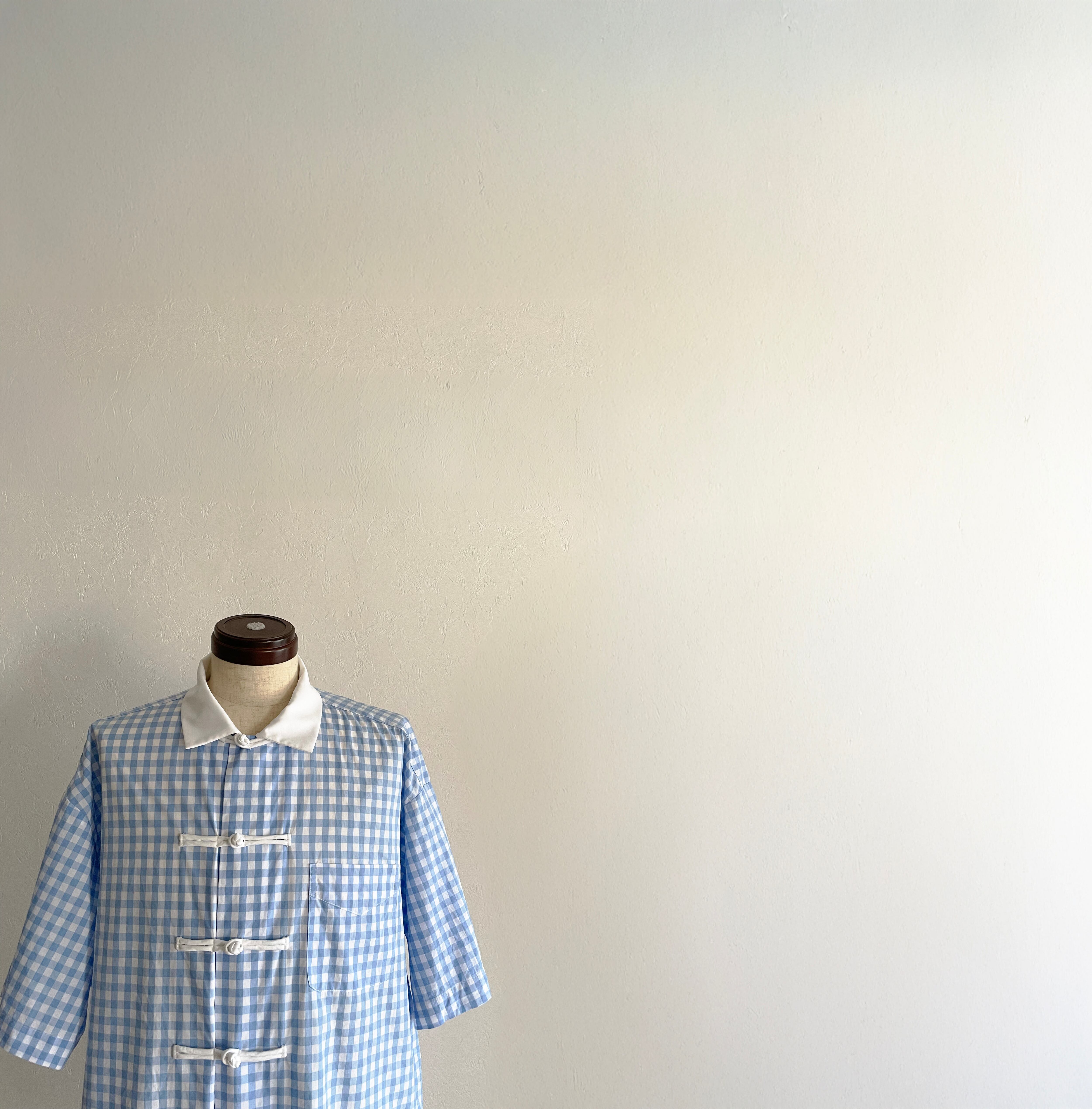 軽やかな“プレッピー”の香りをまとうブルーギンガムチェックに、Slack.がチャイナボタンを掛け合わせると、どこか均整を崩されたような違和が生まれる。