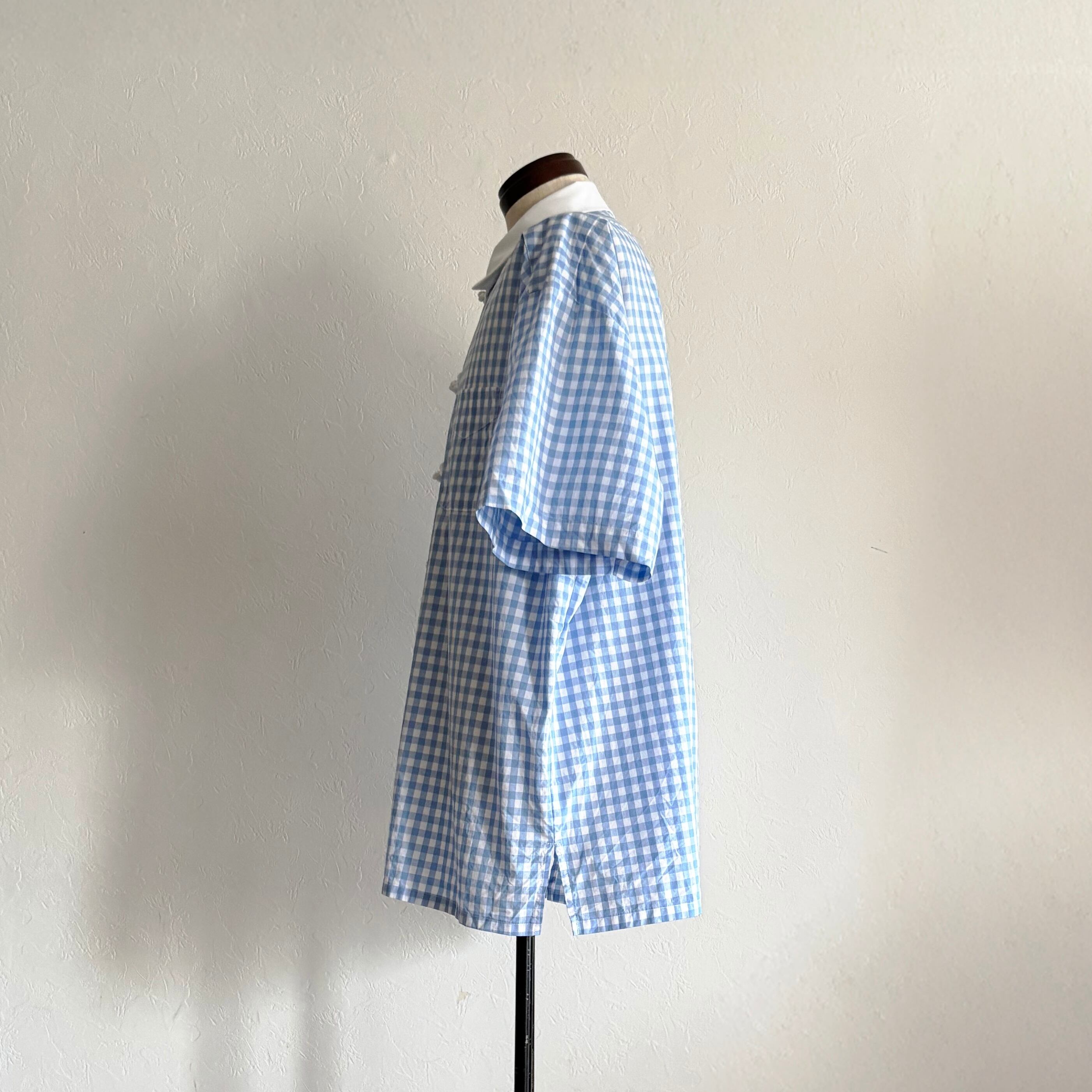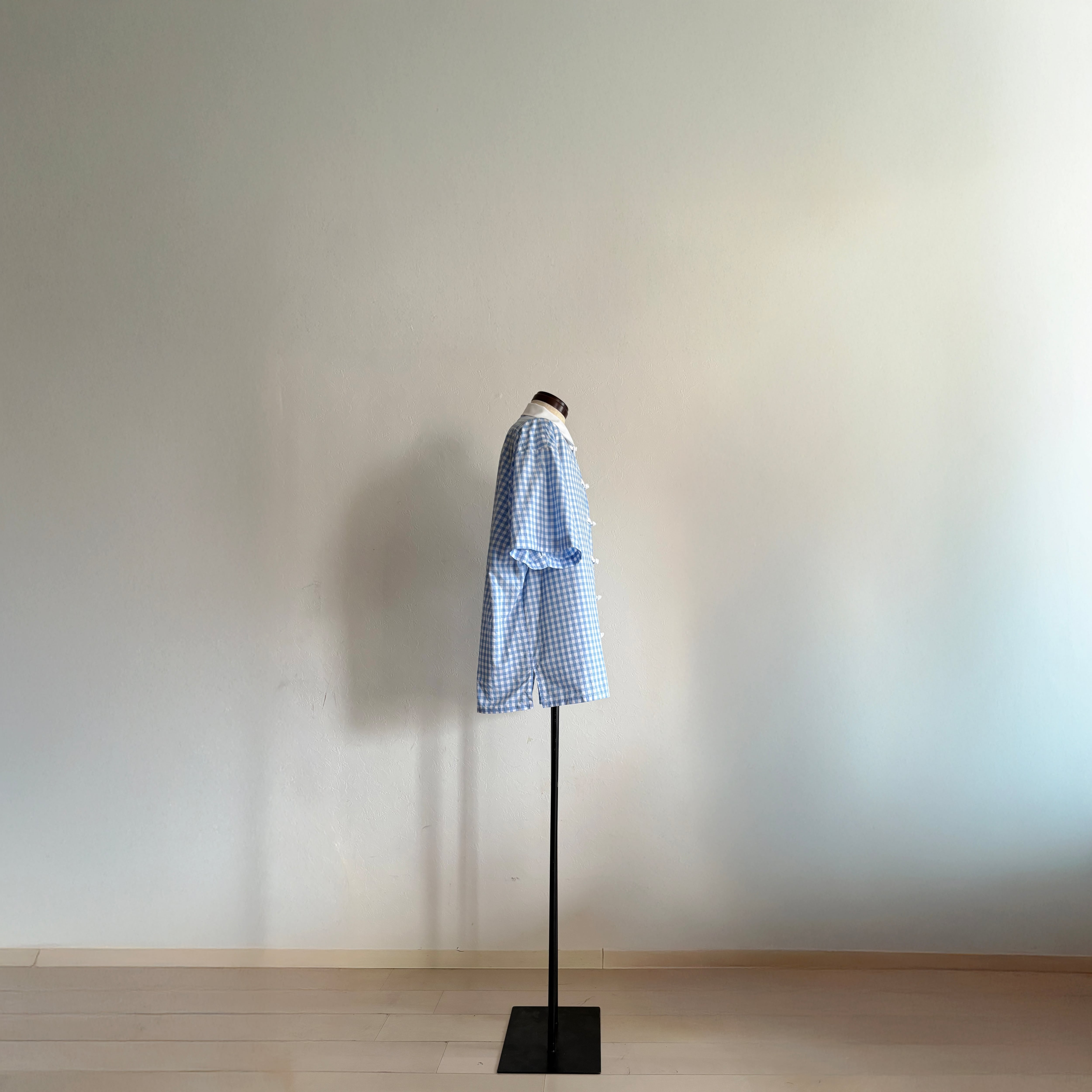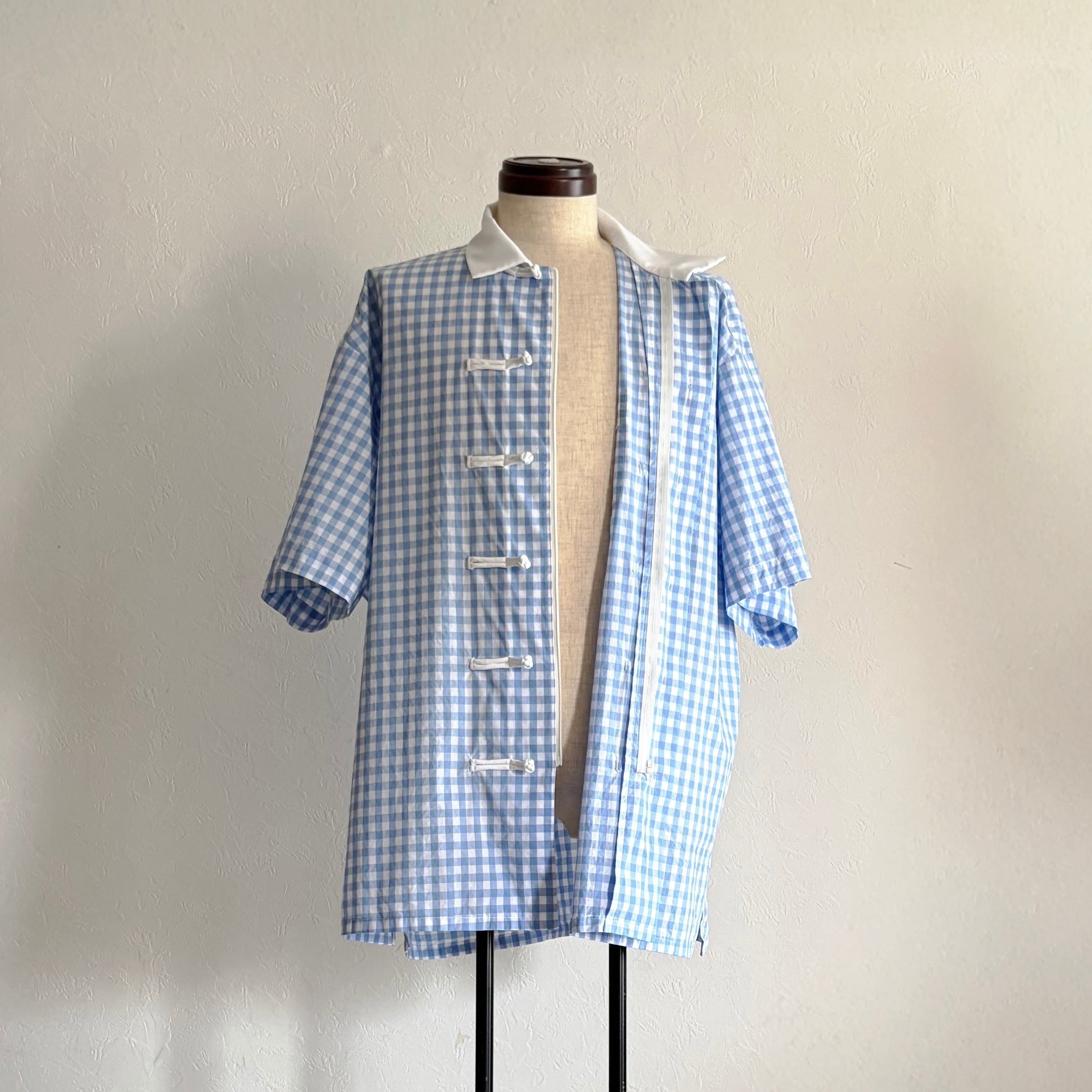 軽やかな“プレッピー”の香りをまとうブルーギンガムチェックに、Slack.がチャイナボタンを掛け合わせると、どこか均整を崩されたような違和が生まれる。