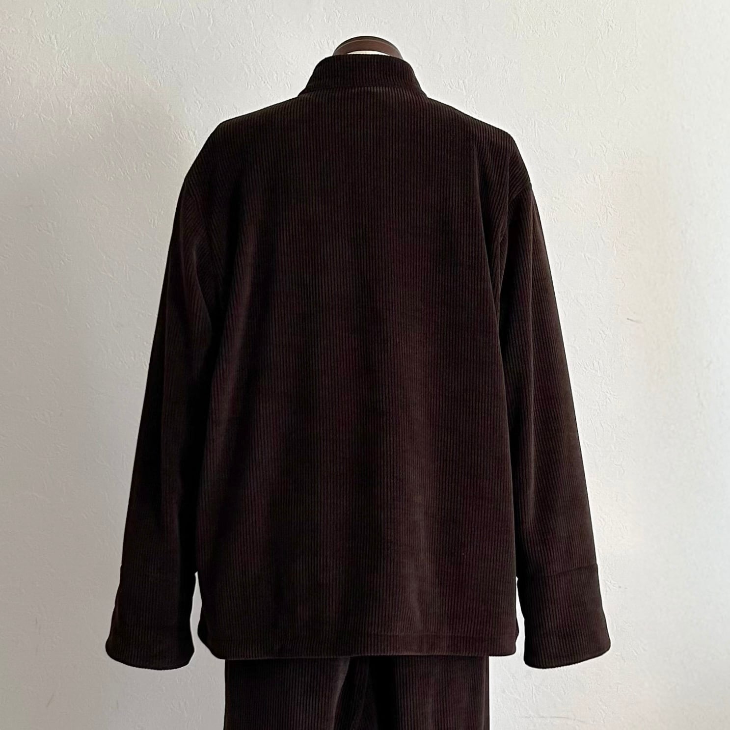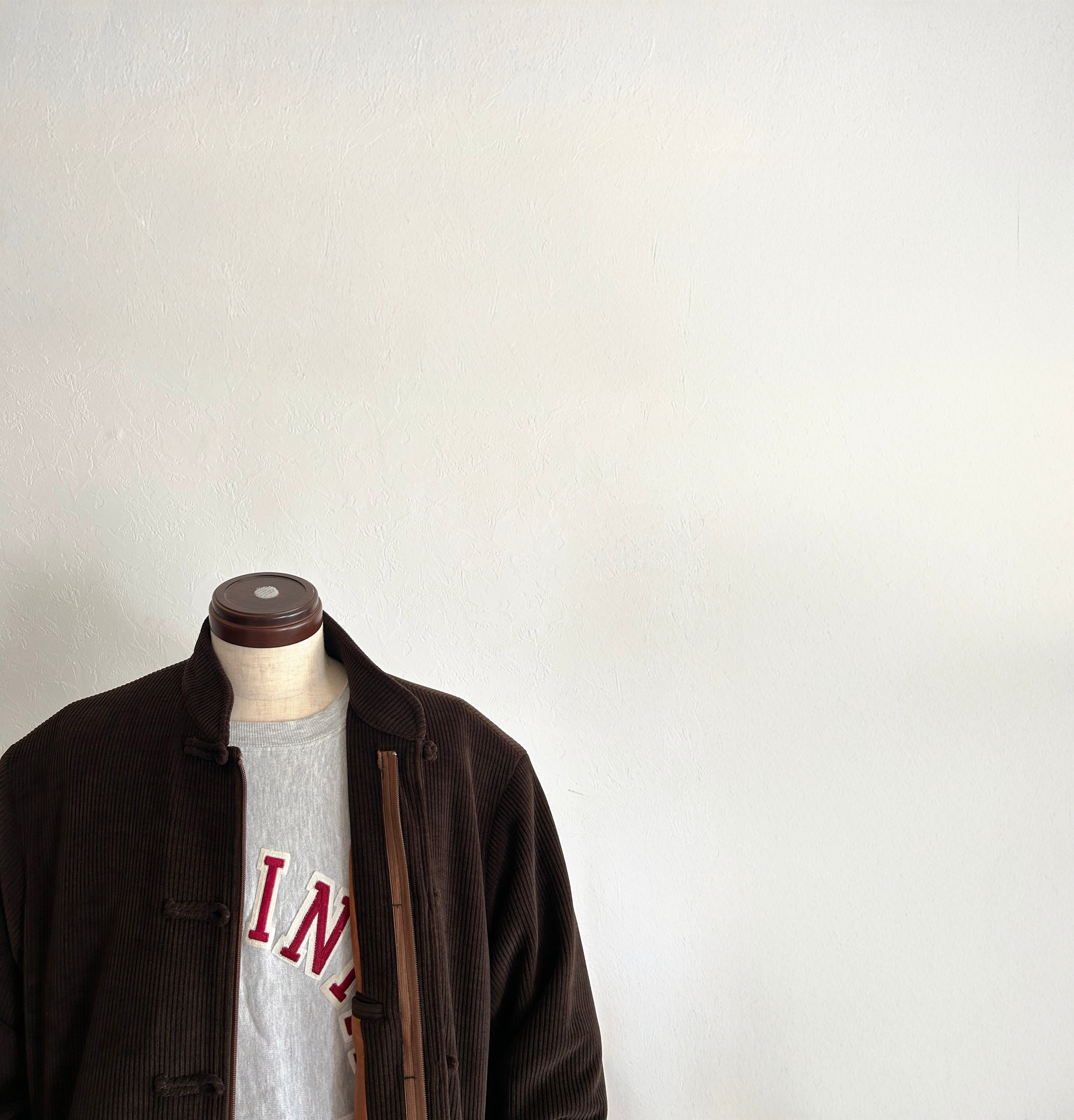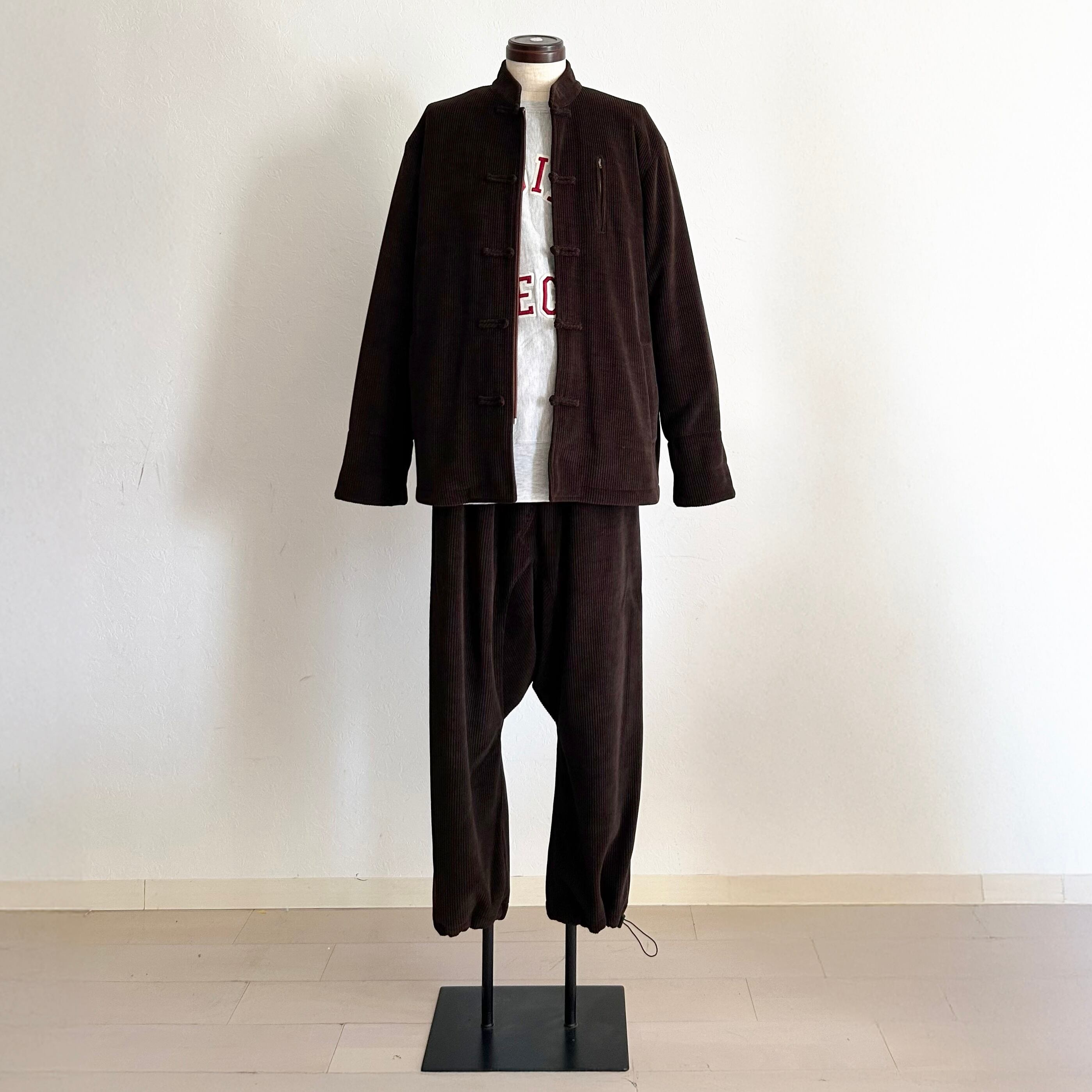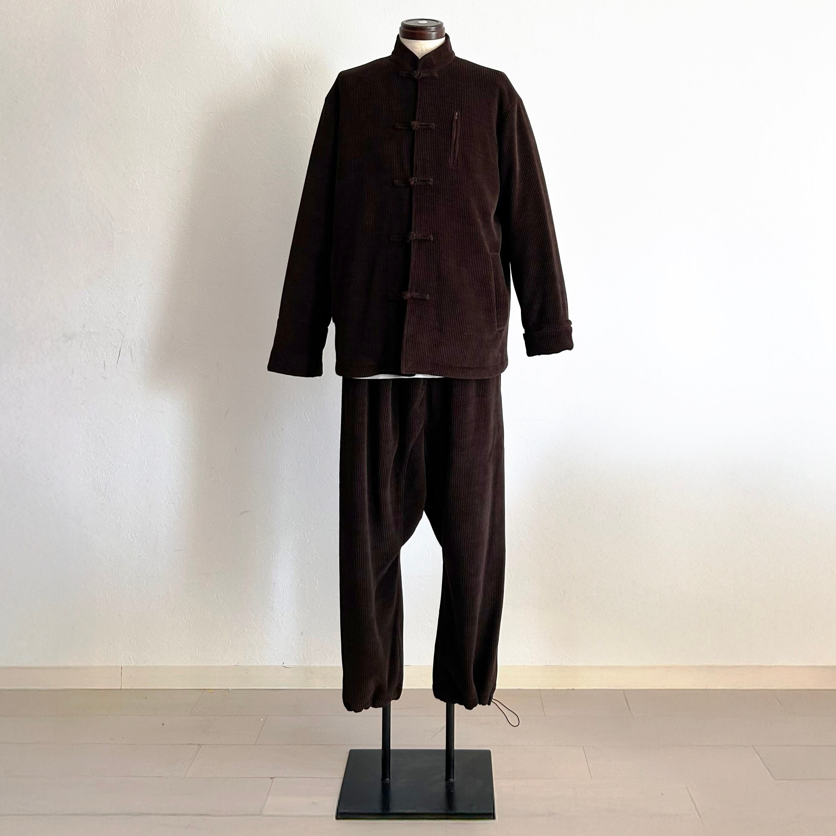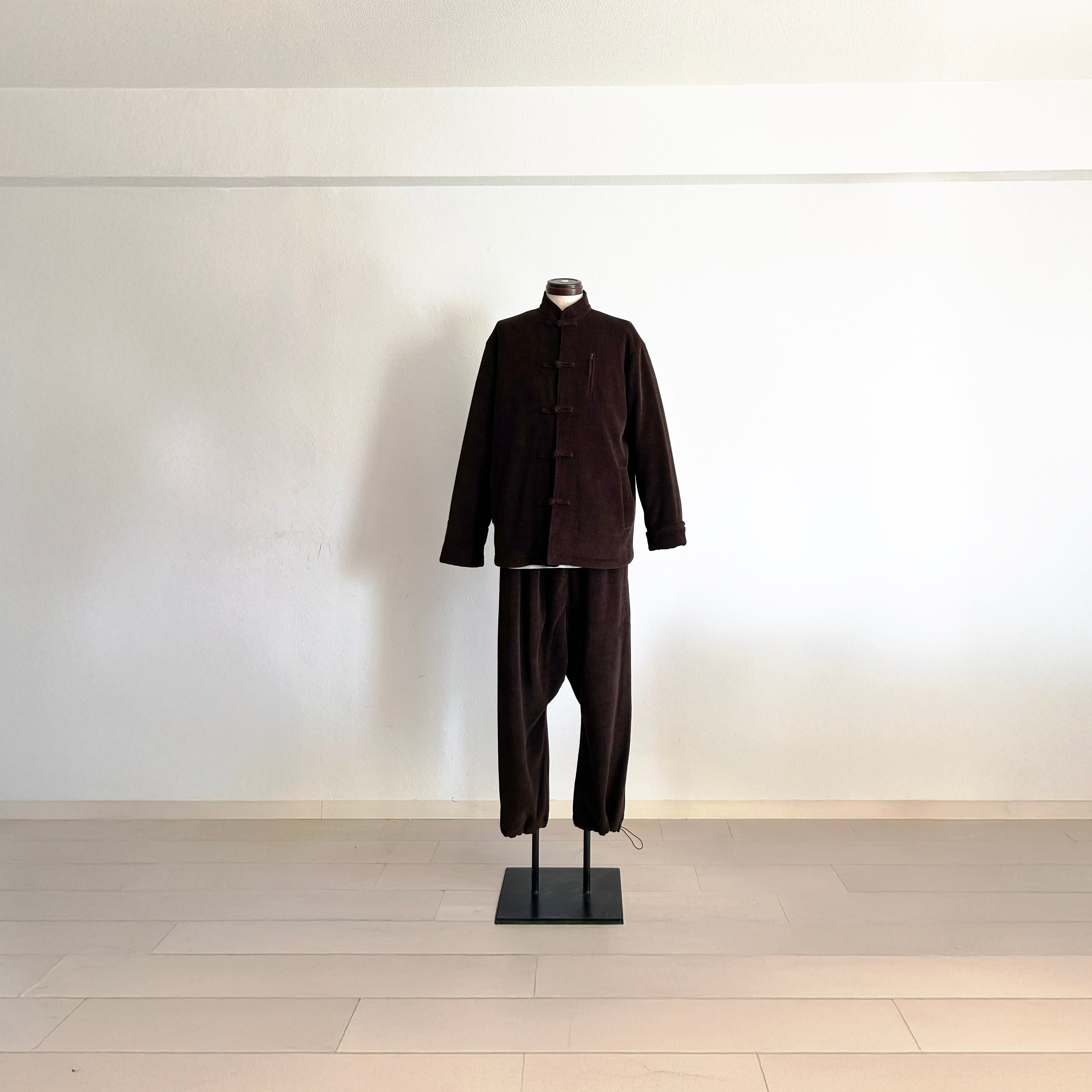 畝の立ったコーデュロイという素材に、チャイナの静かな線を重ねる。