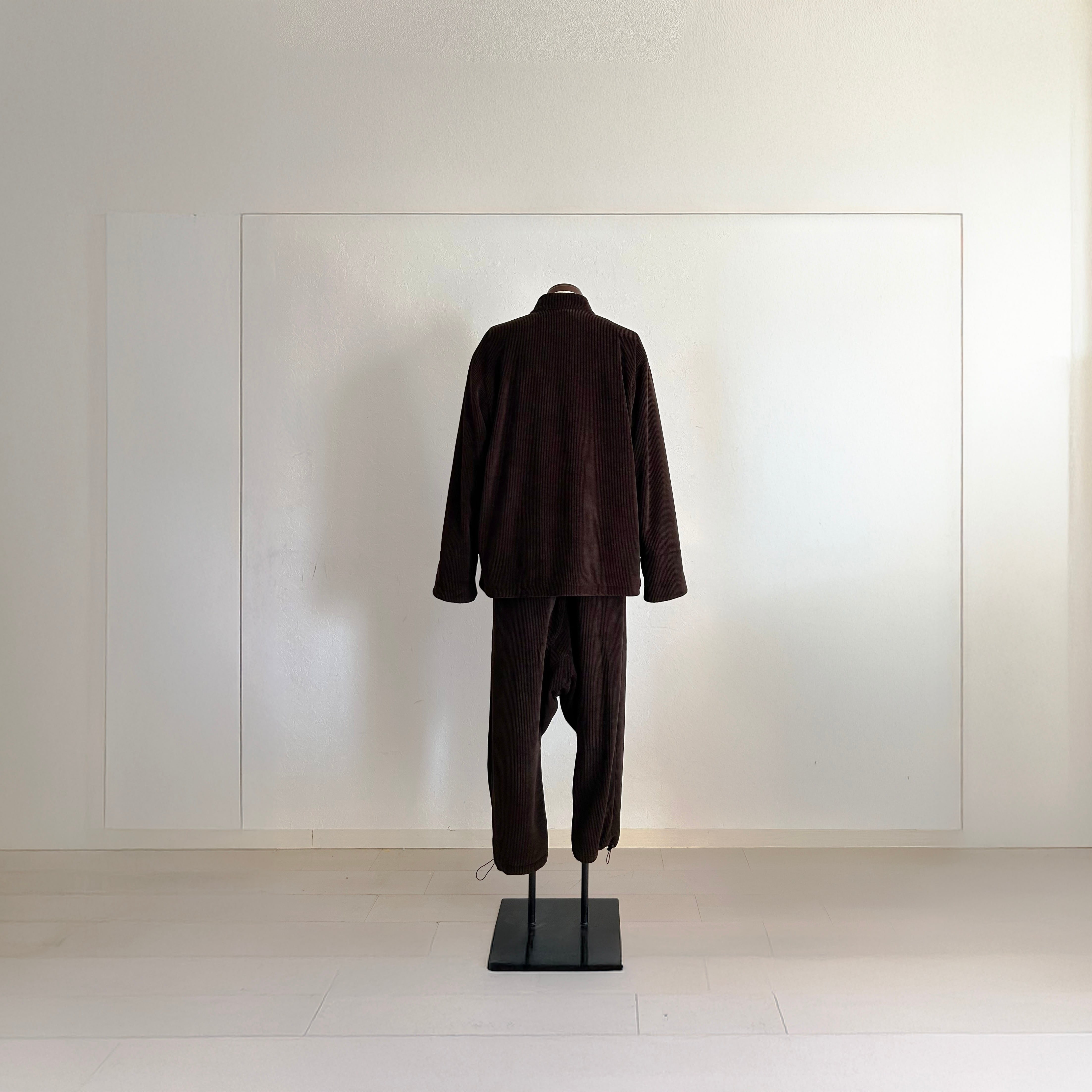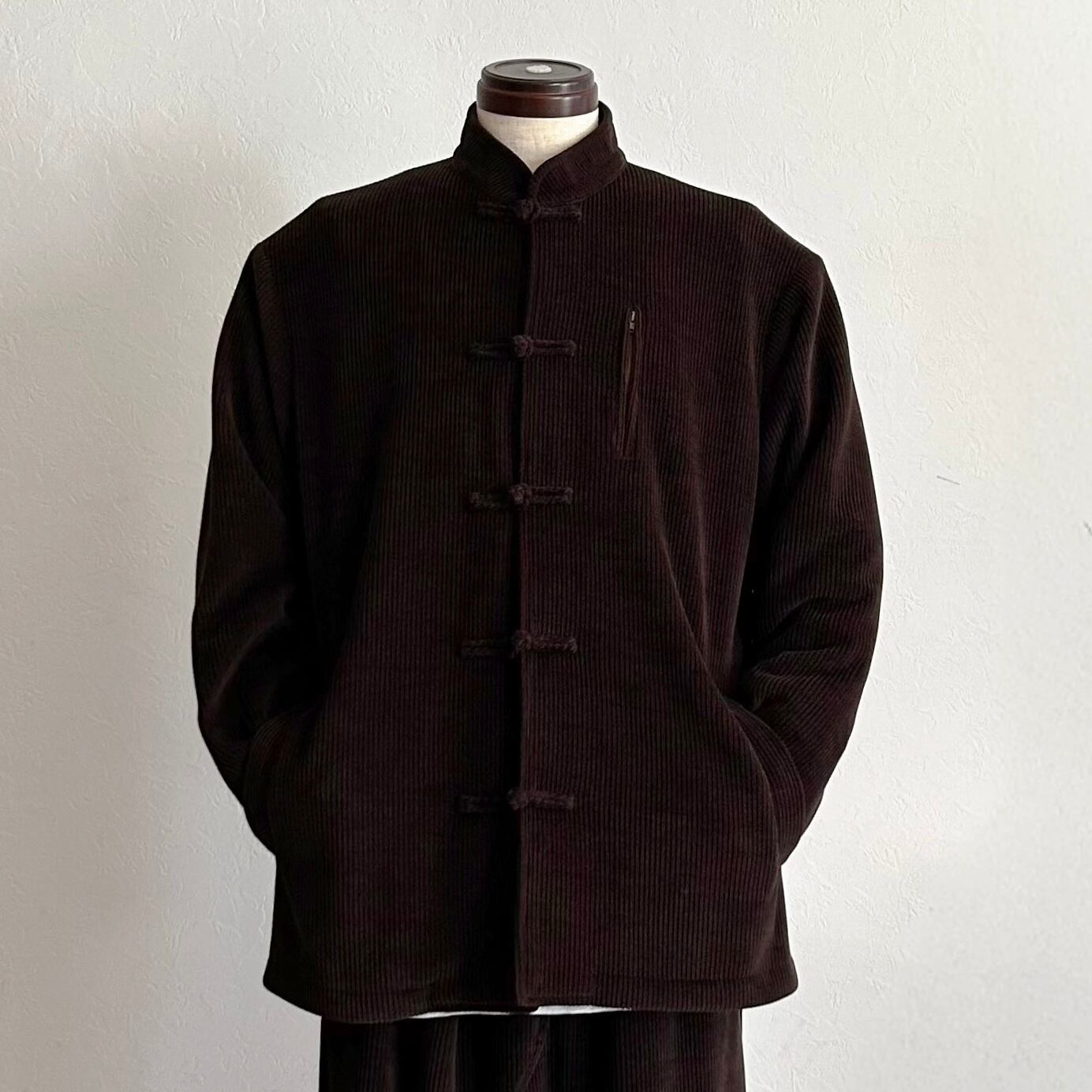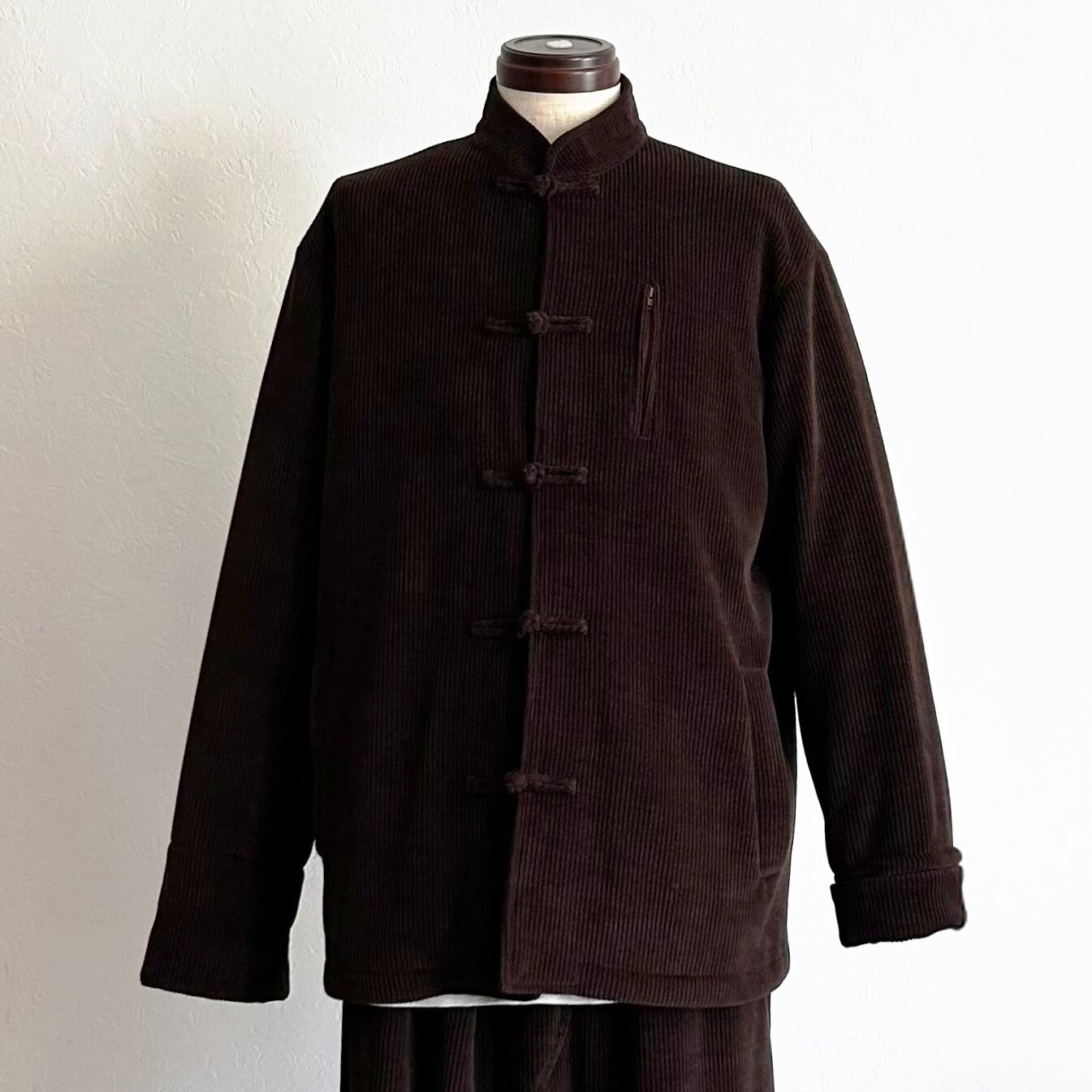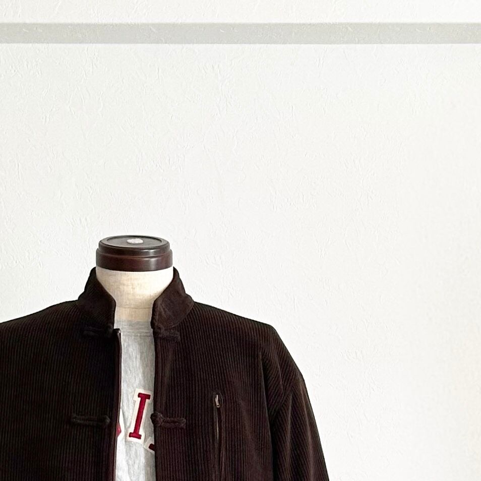 表情豊かなブラウンのコーデュロイをベースに仕立てたチャイナジャケット。
