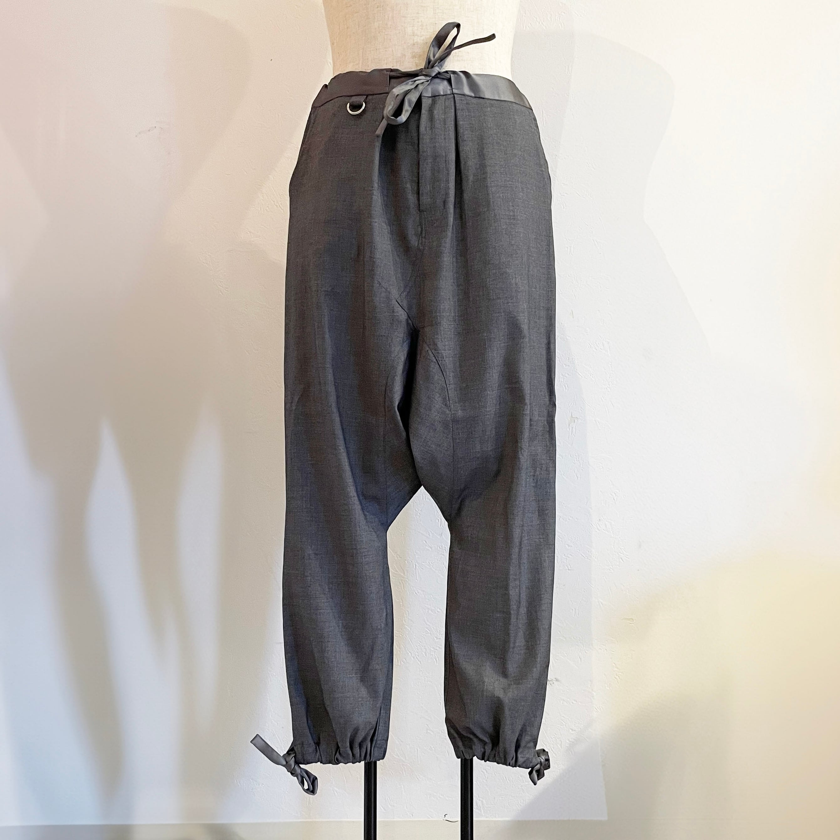 ・シルエットは膝までゆったりとしたシルエットでサルエルパンツのデザインである股上も大きく取り、膝下から細くテーパードしており、綺麗なシルエットでゆったりとした物にしております。