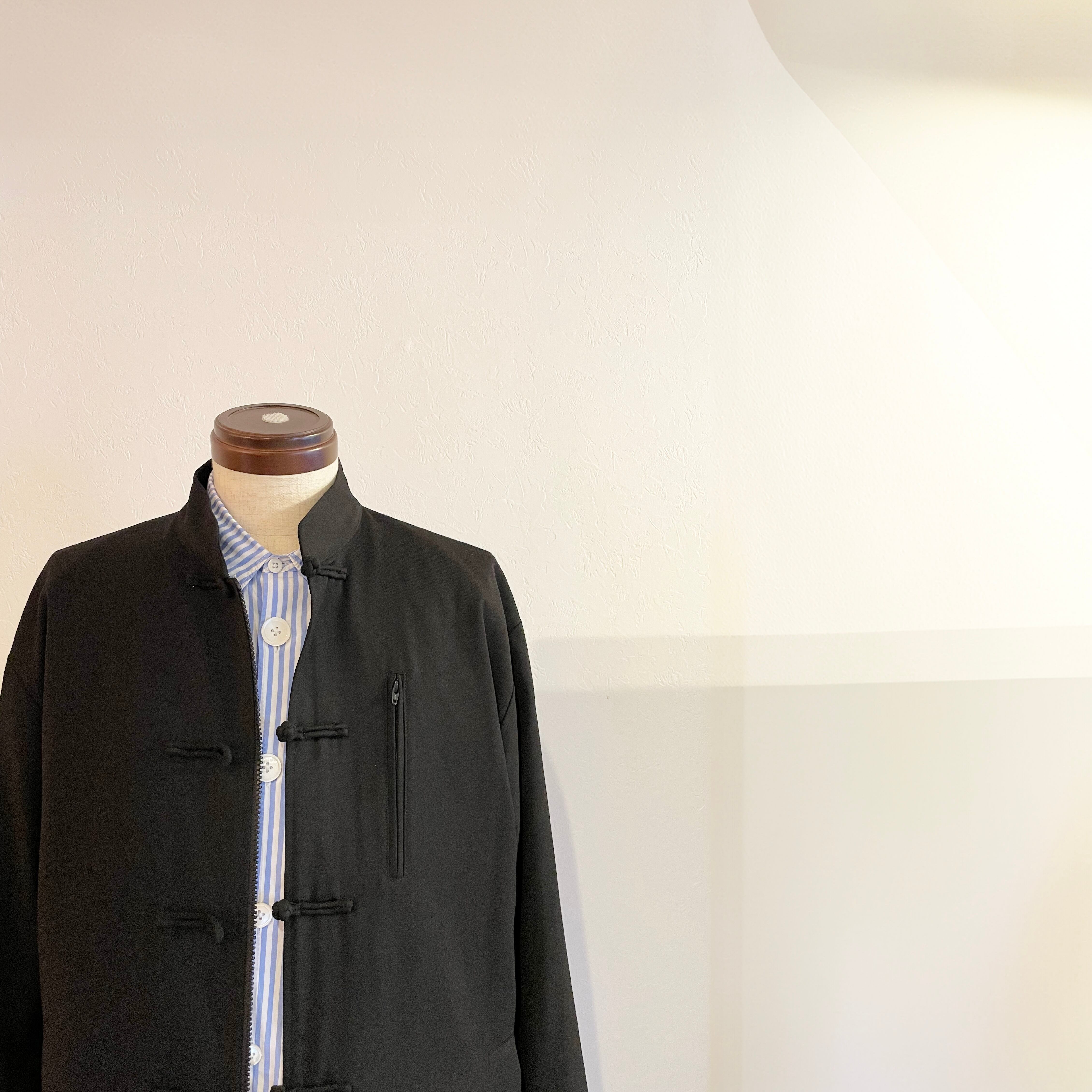 袖裏の立体裁断用に取られている切り替えしの一部をベースに使用しているストライプ幅よりも細い同カラーのマイクロストライプに変更し、ストリートとモードの中間の様な見え方がするように作成しております。