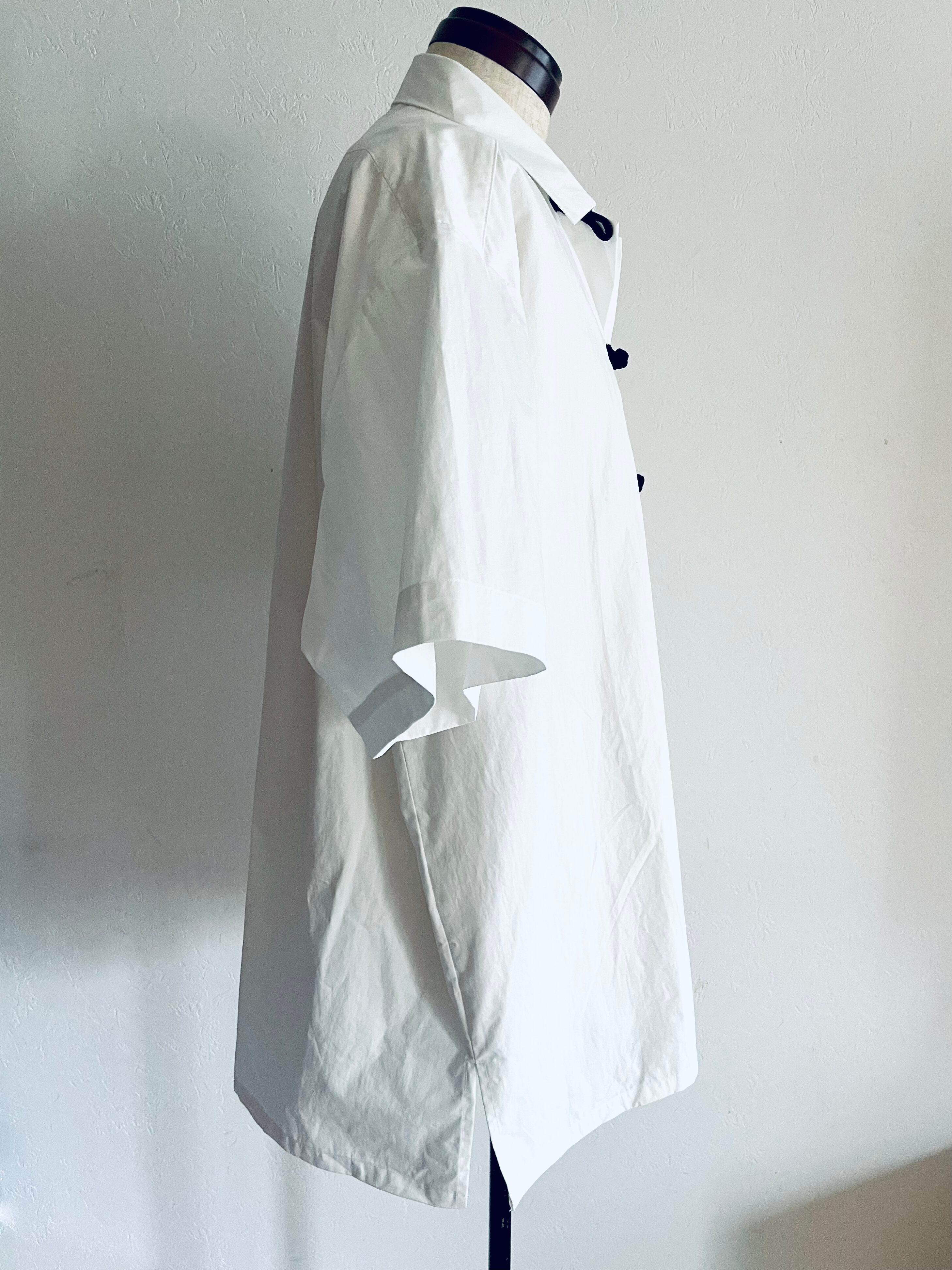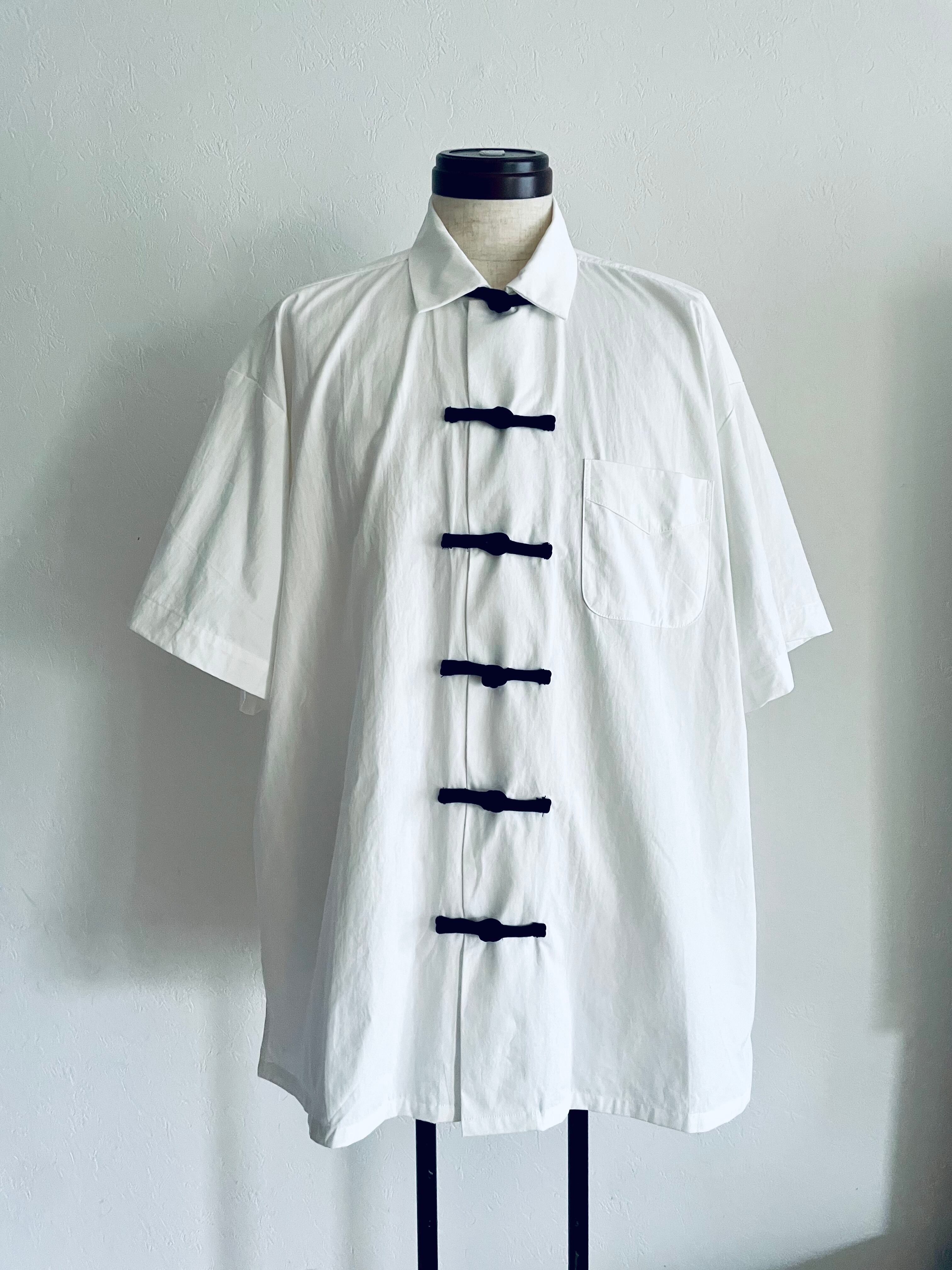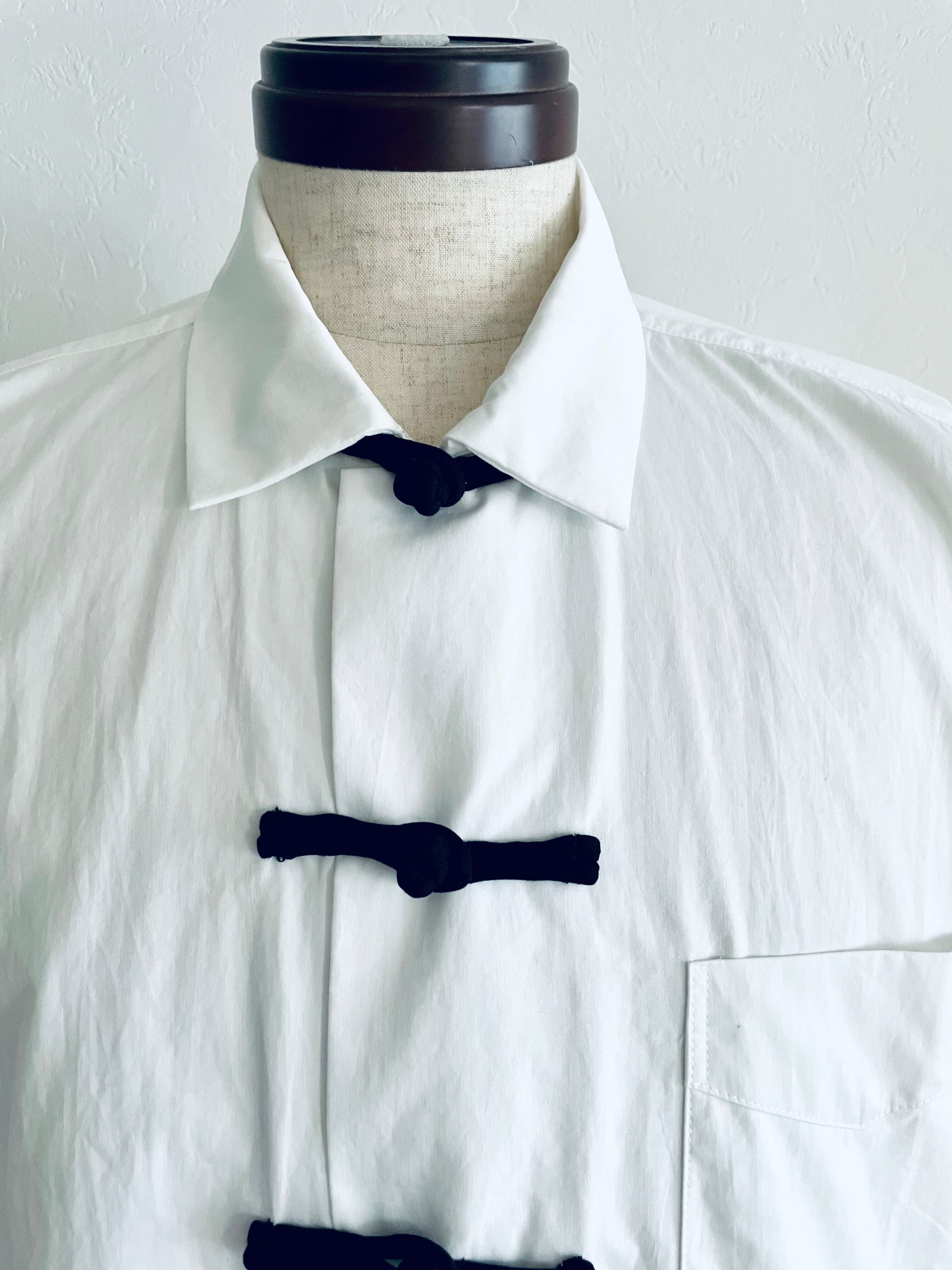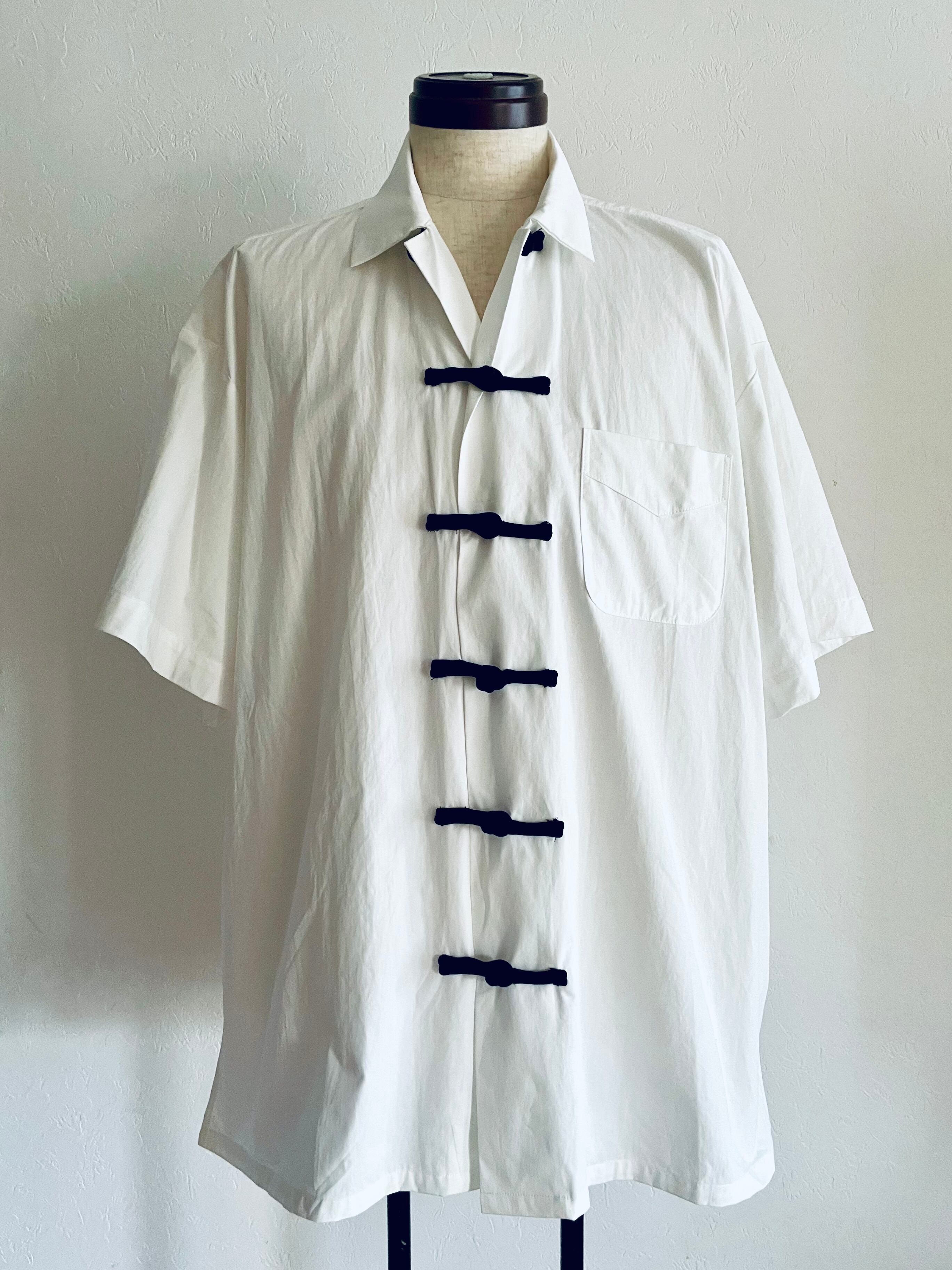 前立てのボタンがチャイナトグルボタンのデザインのオーバーサイズシャツです。