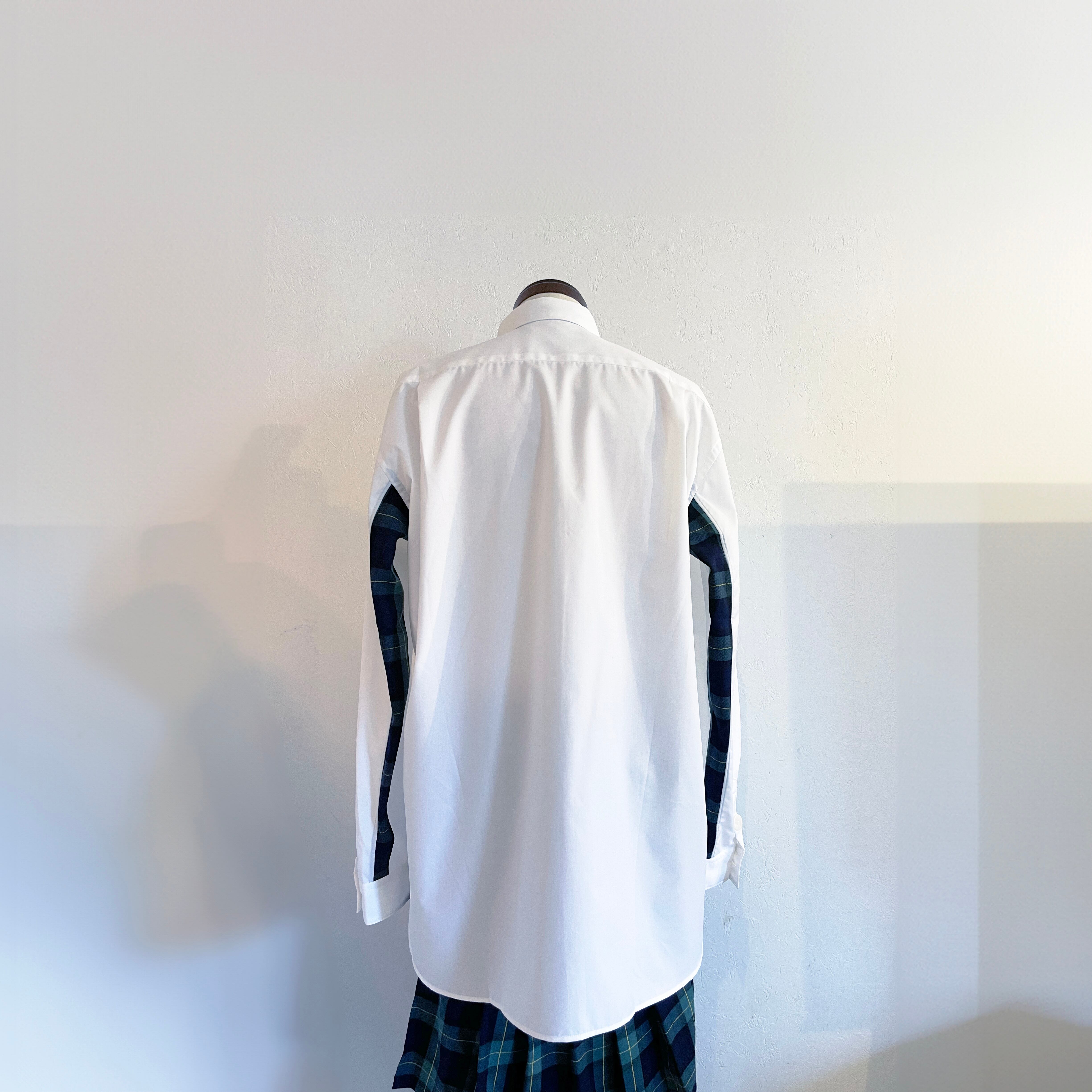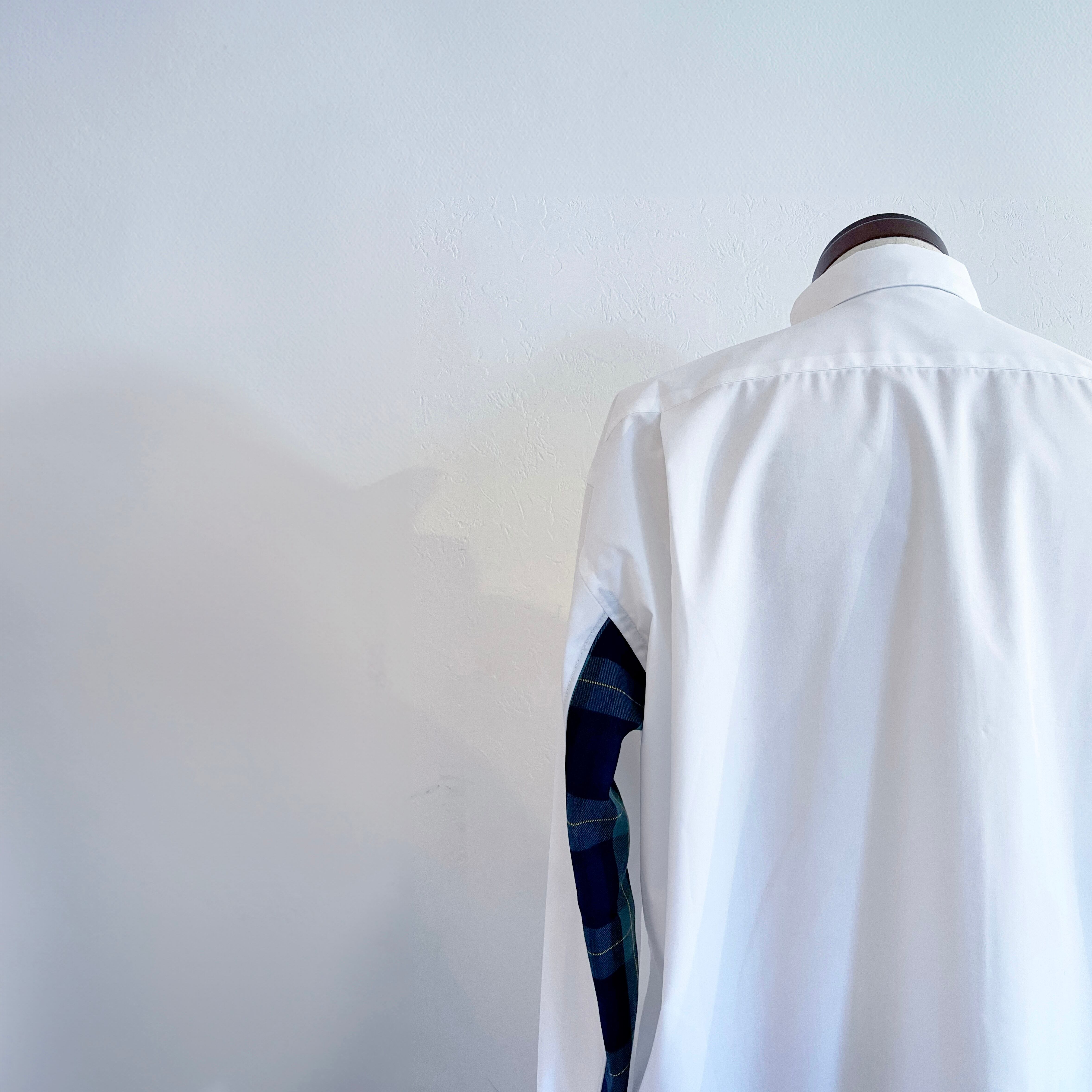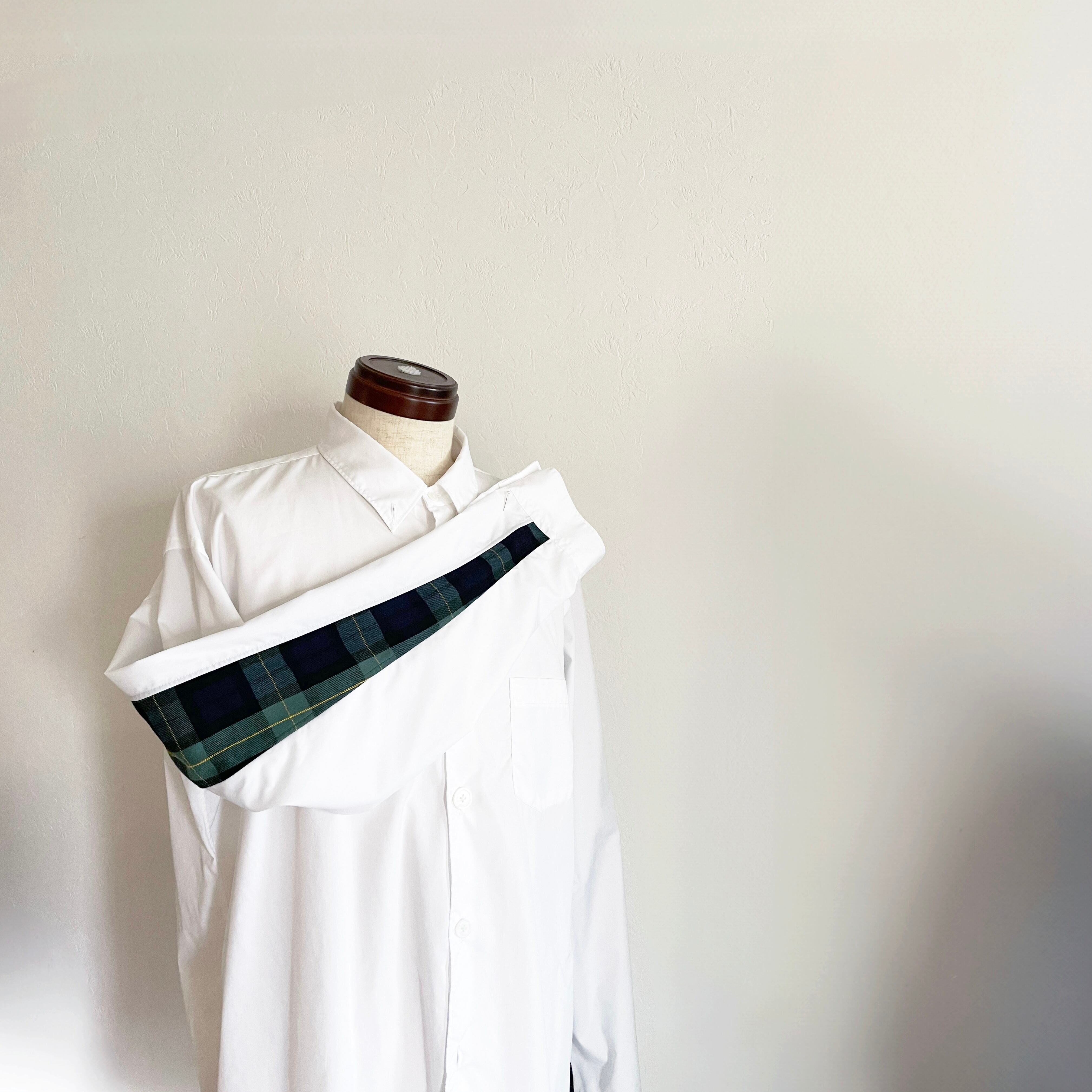 袖裏の立体裁断用に取られている切り替えしの一部をタータンチェック柄に変更し、ストリートとモードの中間の様な見え方がするように作成しております。