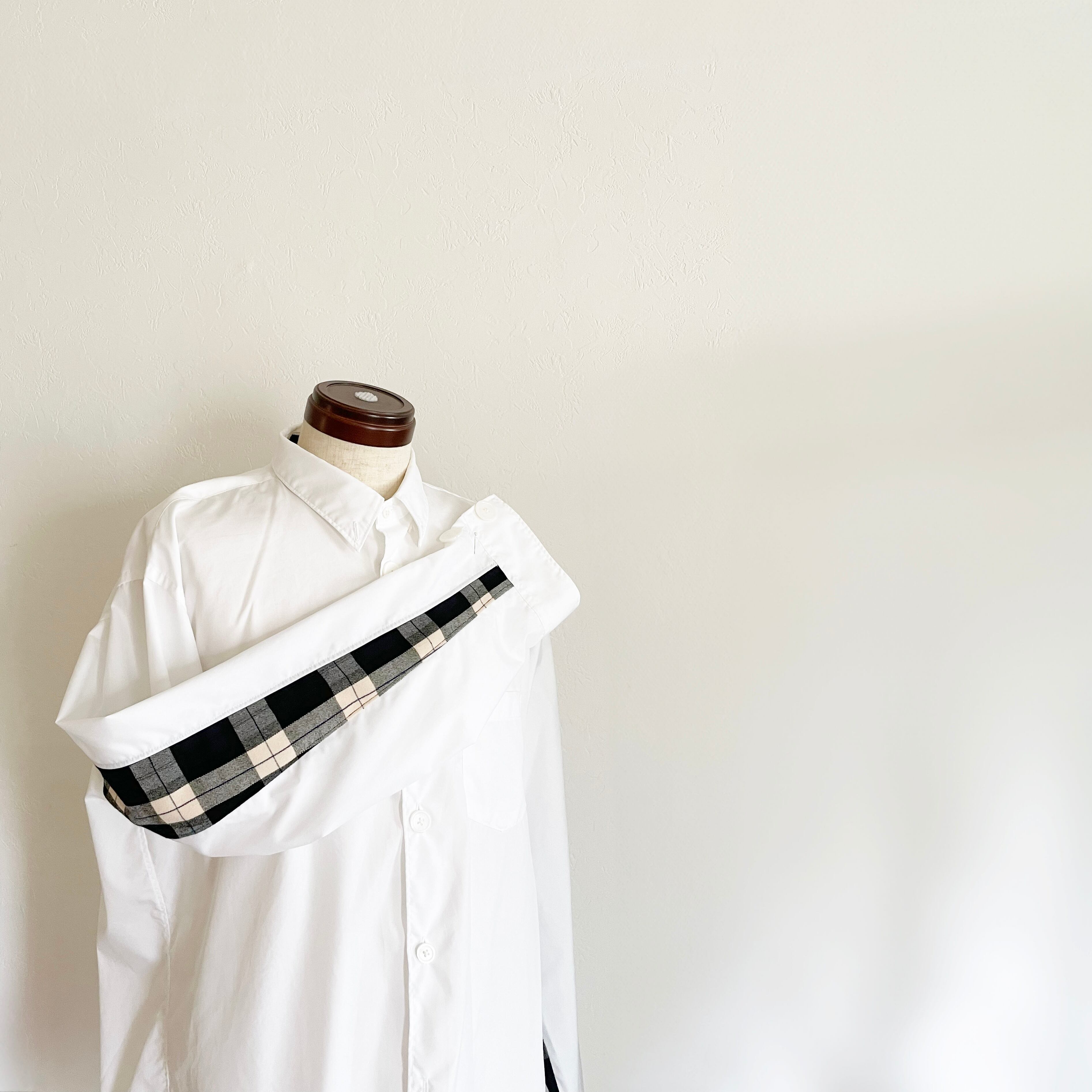 袖裏の立体裁断用に取られている切り替えしの一部をタータンチェック柄に変更し、ストリートとモードの中間の様な見え方がするように作成しております。