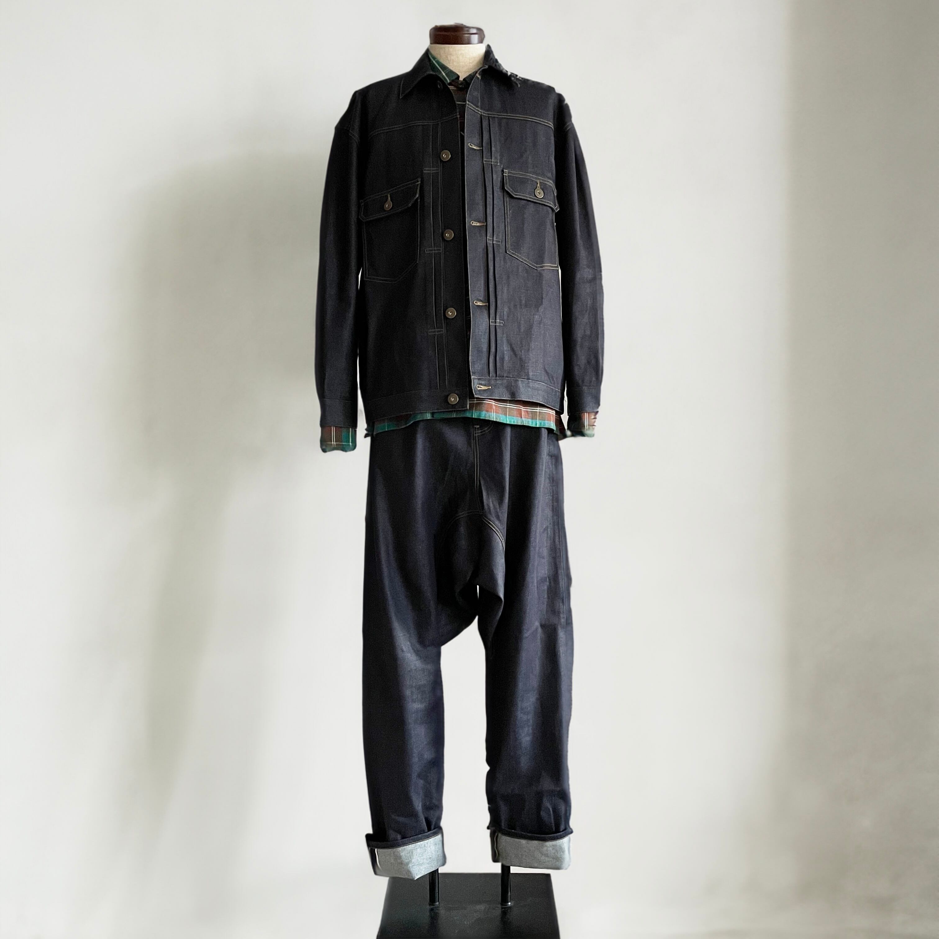 ・地厚の硬い素材で、ノリがついたノンウオッシュのデニム地ですが、着ているうちに柔らかくなり、穿きやすくなってきます。